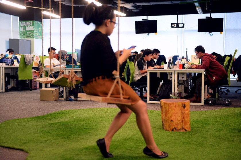 An employee uses a smartphone while sitting on a swing as others work at PT Tokopedia’s offices in Jakarta, Indonesia, on Friday, Feb. 19, 2016. (Dimas Ardian/Bloomberg via Getty Images)