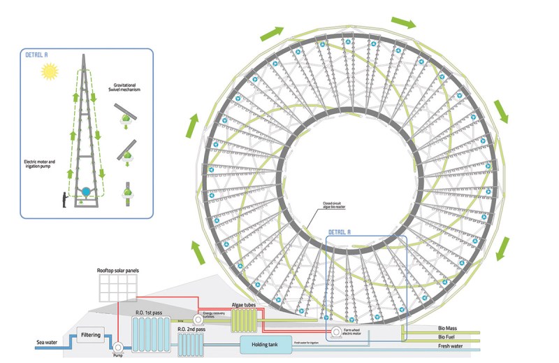 The garden’s rotation and desalination processes are powered by photovoltaic panels, and it takes in seawater through screens that keep sea life out. The water is then cleaned by a high-pressure pump and distributed to an irrigation system for the rotating plants and Santa Monica’s water grid, respectively. Any leftover brine water is redirected to biomass production. Predonu is confident that his Ring Garden will redirect more than 300 million gallons of water a year to drought-stricken Californians, while only using nine million gallons itself.