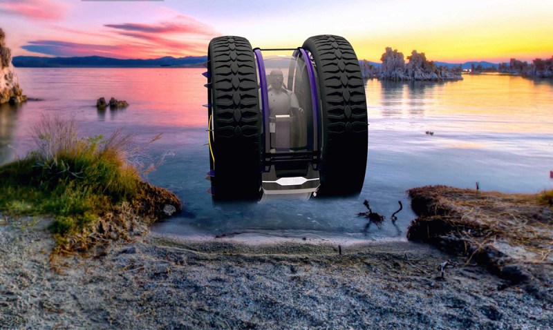 The pair have produced the concept for a spherical two-person vehicle they’re calling the Libelule. With two large, durable wheels affixed to its sides, the Libelule can hit just about any surface on land or expertly handle itself through mud and muck. Then it can seamlessly shift into “marine mode,” as the wheels become like the paddle wheels on a Mississippi riverboat. From there, the Libelule can dive into “underwater mode,” with sensors telling passengers to prepare for submersion. They would then don scuba gear, and the cockpit would fill up with water. (Underwater maneuvering would be possible via the side-wheels, as well as a special tail section that would deploy.)