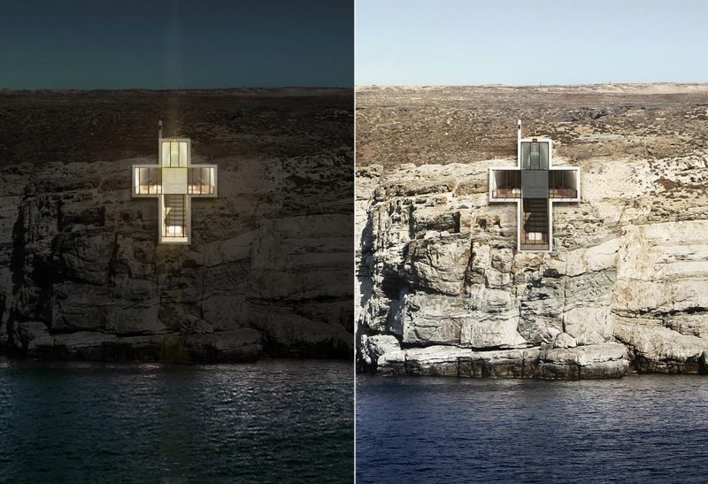 Open Platform for Architecture espouses “Transcendental Brutalism,” a style embracing the brutal (using concrete as a building material and celebrating rugged terrain) while creating something transcendent. Its proposed chapel of The Lux Aeterna Holy Cross Chapel is designed to use a “minimalistic design devoid of earthly distractive elements” to capture a “purity of belief.”