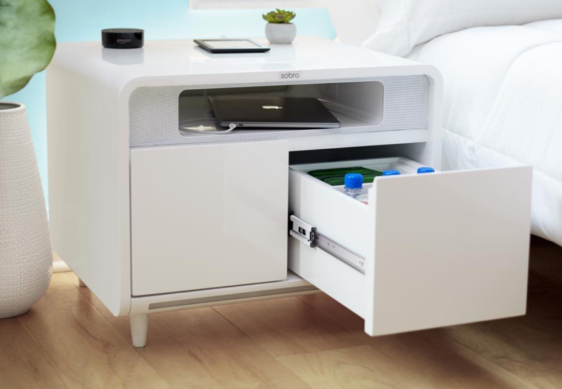 Do any of us really need an LED-equipped smart bedside table that can wirelessly charge your phone, play music and keep beverages or your favorite midnight snack cold in its refrigerated door?