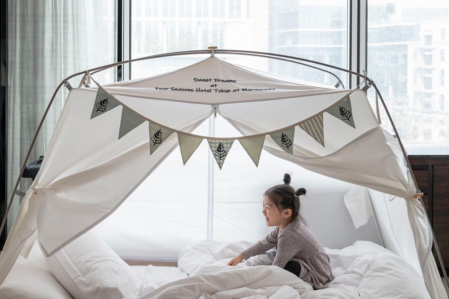 Another luxurious option, The Ritz-Carlton, Tokyo occupies the top floors of Tokyo Midtown and welcomes kids with open arms and extra special necessities like cute balloons. There’s a kids’ corner off the lobby with books and toys. You can also book an in-room camping amenity that comes with a tent, pretend s’mores and a camp light. Our toddler was obsessed with this and asked if we could take it home. Luckily, the backpack, coloring books and stuffed animals are souvenirs to keep.