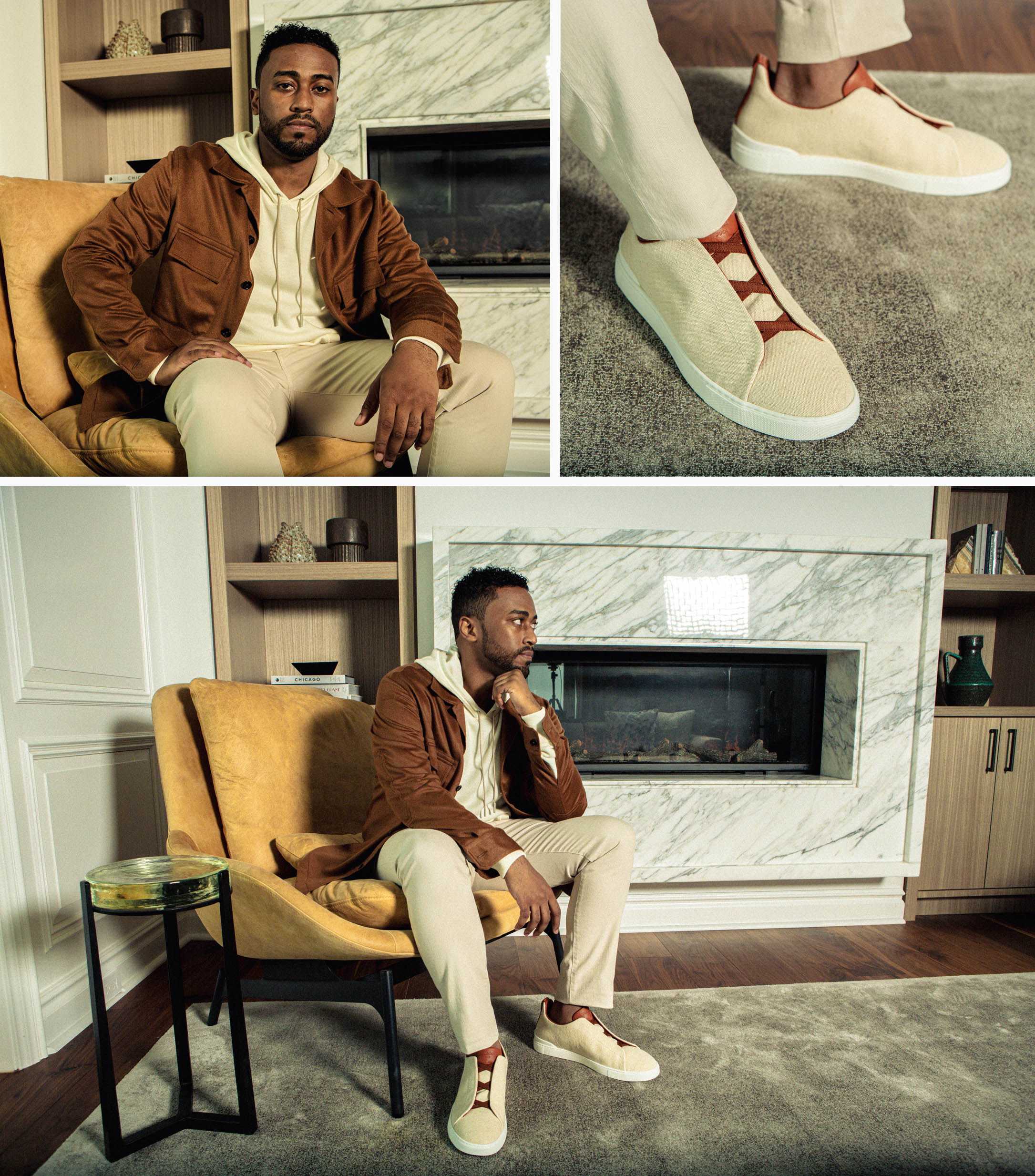 Jamian is styled out in what Ermenegildo Zegna calls an “overshirt” but we at InsideHook have always referred to (with reverence) as a “shacket.” A handsome combo of shirt and jacket, this one benefits from a butter-soft cashmere construction in a deep shade of walnut — the perfect piece to anchor a more tonal casual getup (particularly when it matches the leather on your sneakers) or add a bit of warmth and color to a darker, more evening-appropriate ensemble.