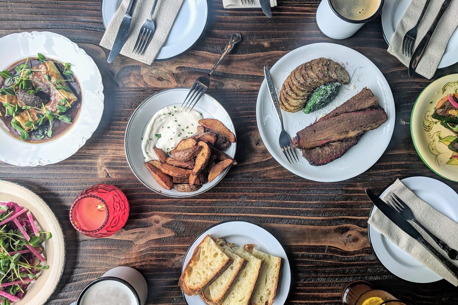 “We try to find new and interesting ways to butcher animals so we can get different cuts out of it, smoke things differently, put together different types of dishes that have a familiar flavor profile but with an added layer of smoke so you’re combining BBQ with Indian food or BBQ with Thai food,” says Bruns. “To me, if you come to Flat & Point, you’re not just coming for great ribs, you’re coming to eat the food that I like. A lot competition people come into the restaurant and I have to remind them that this is a restaurant, not a competition. I’m not here to make better Memphis-style, better Texas-style, better South Carolina-style, whatever. I’m here to do what I love to do.”