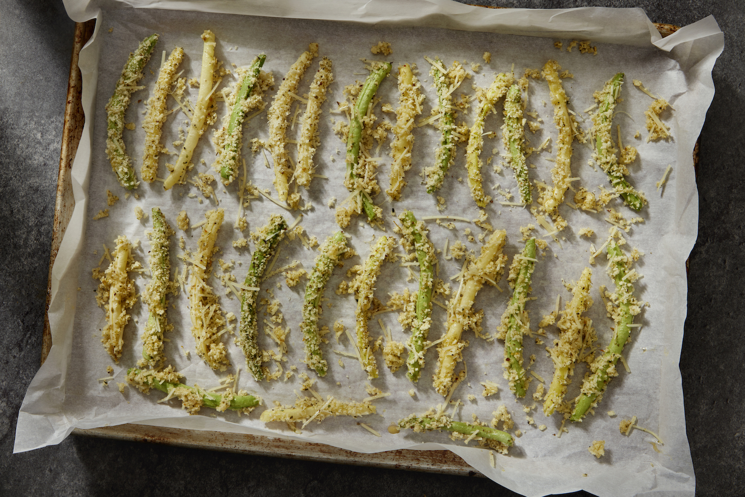 Remove the preheated baking sheet from the oven and drizzle it with the extra-virgin olive oil. Arrange the breaded green beans on the sheet and bake for 12 to 15 minutes or until they achieve a golden, delightful crispness, turning once halfway through cooking. Once cooked, transfer to a serving dish and garnish with the lemon zest.