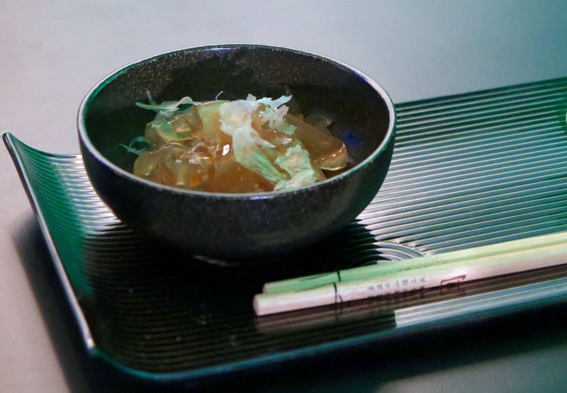 Laura Duca, the bartender representing the United Arab Emirates, believes that the future of cocktails is serving them in unexpected ways—like as if it were an Asian noodle soup. The gelatin noodles are made with Tanqueray gin, Cynar artichoke liquor, grapefruit bitters, lemon and apple juice, and served with a hot chamomile tea.