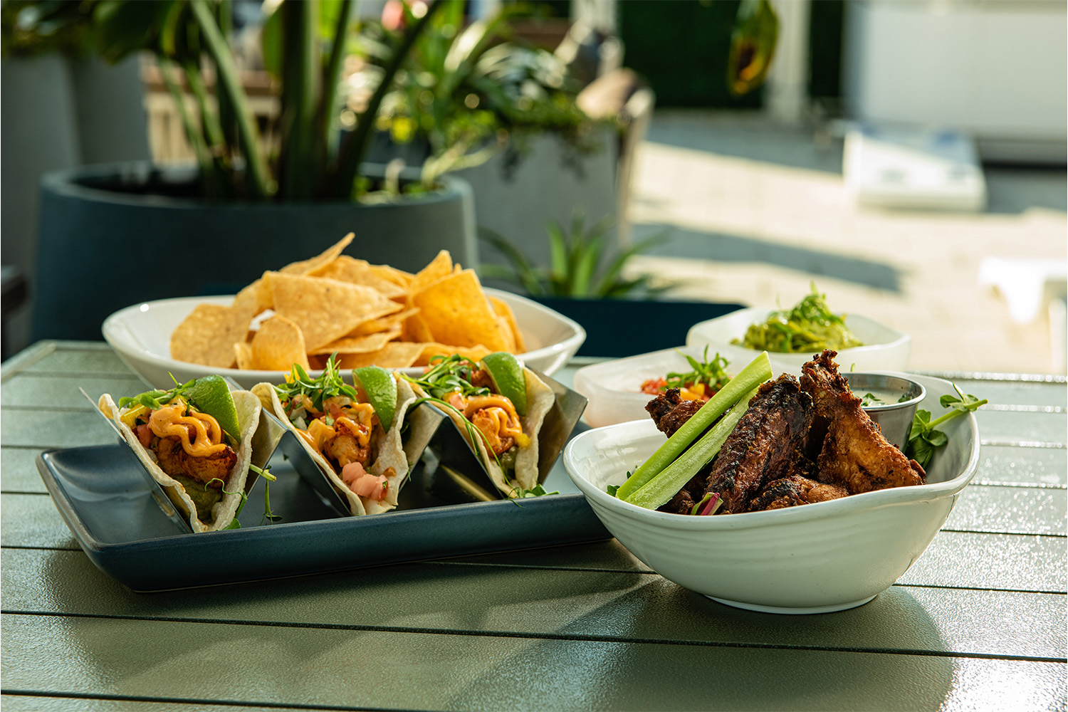 You’re dining on: Elevated pool bites like jerk chicken wings, pork belly tacos and a spicy Peruvian chicken sandwich made with aji amarillo. The cocktails here are playful, too. The frozen espresso martinis, boozy popsicles and shareable punch bowls are in line with the bar’s cool poolside setting. Hang at one of the high-top tables spread out under string lights or reserve a cabana for a laid-back pool day.