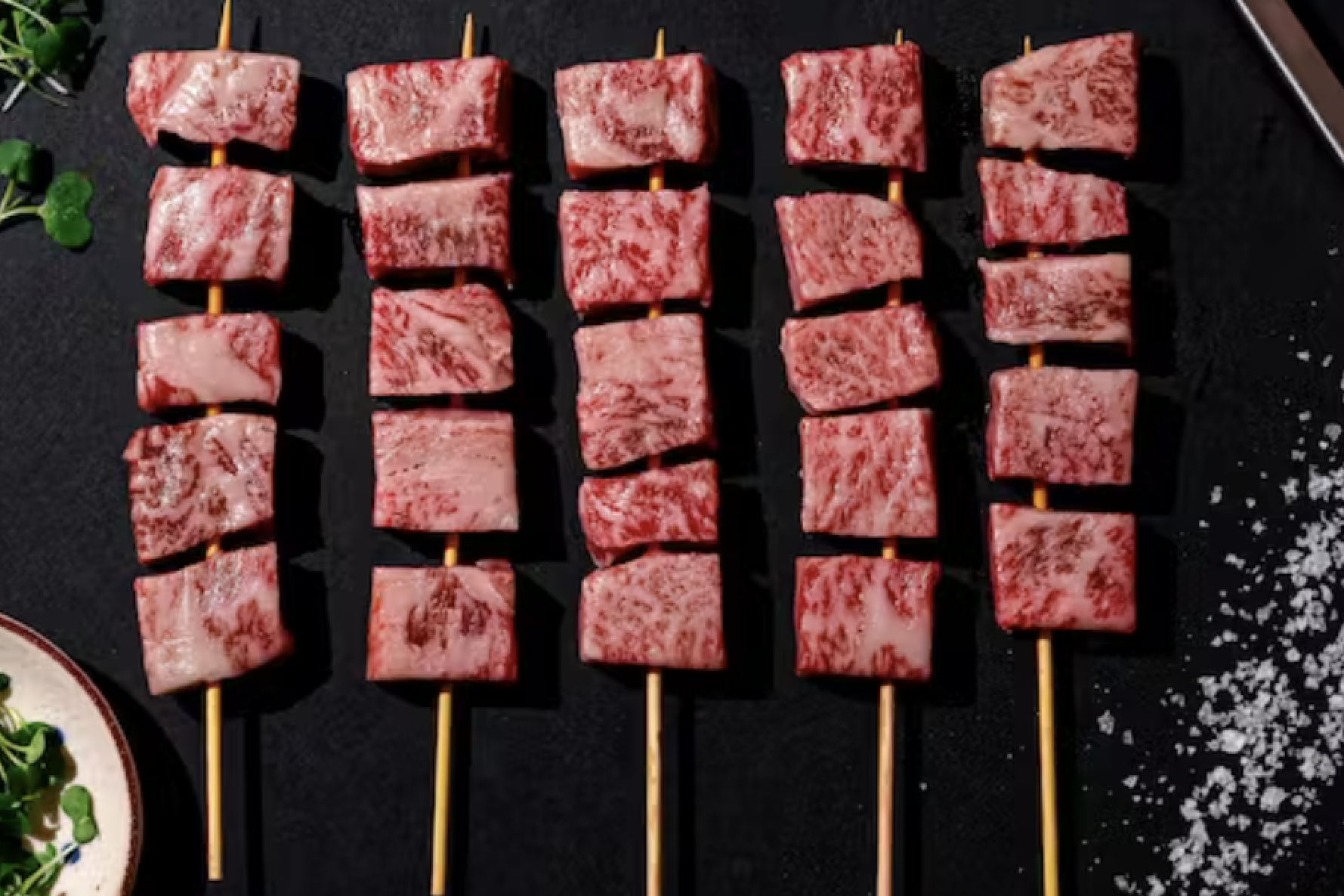 “This is perfect for hosting. I can’t think of something else that’s a faster way to impress your guests,” Liu says. “There’s so much fat marbled through, you don’t even need oil. By the end of cooking, you will have rendered fat to use for greens or potatoes immediately afterward they’ll be the best you’ve ever had. You will find other Wagyu skewers out there, but I don’t think anyone’s doing it with the quality of cut we’re using. This is basically the best meat possible on a skewer. It’s rich to the point where a little goes a very long way because it is so marbled.”