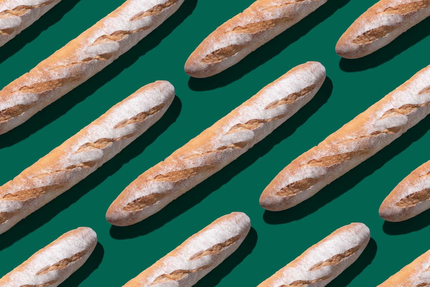 Baguette Long Loaf on Solid Green Colored Background Arrangement Pattern