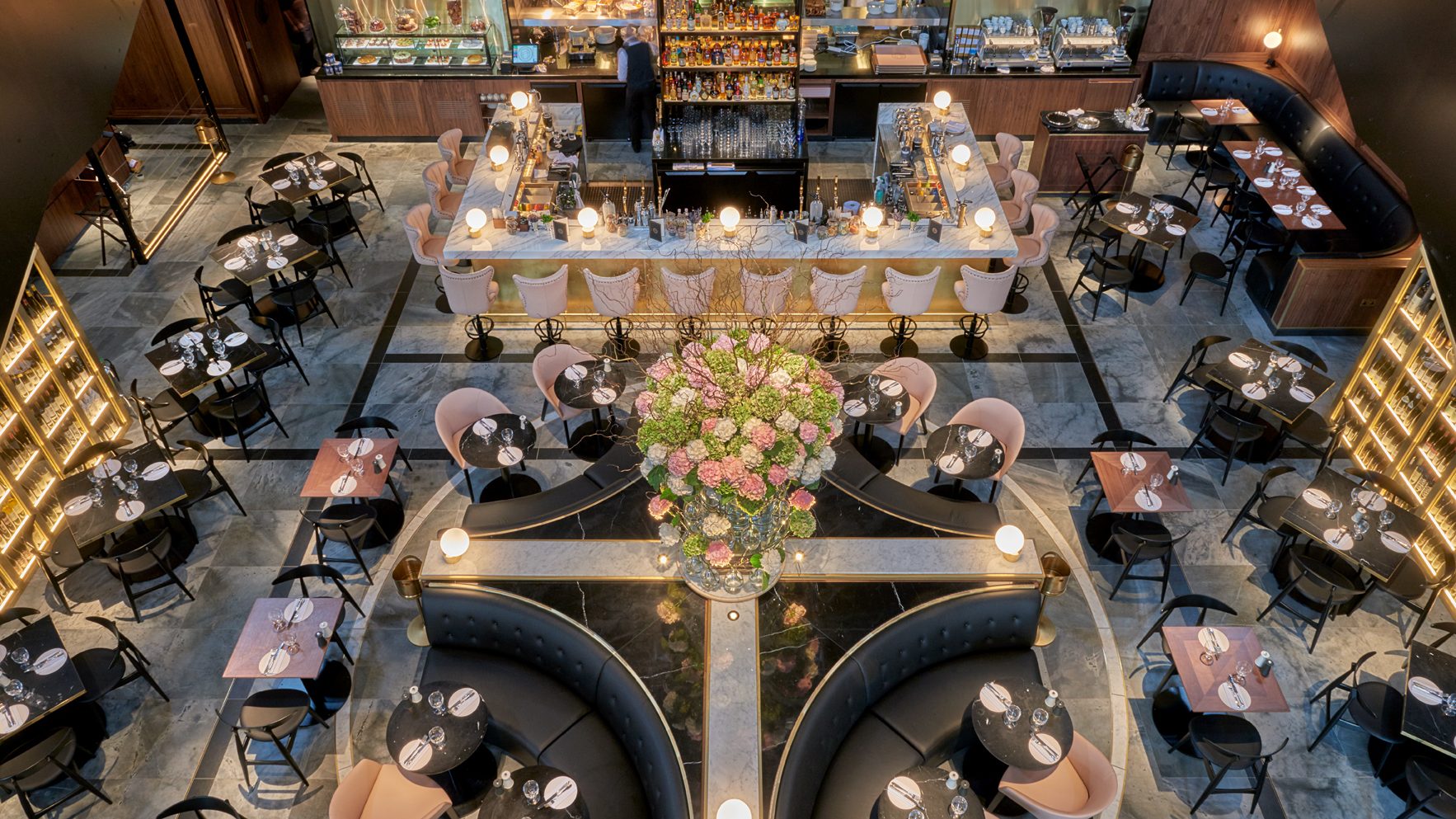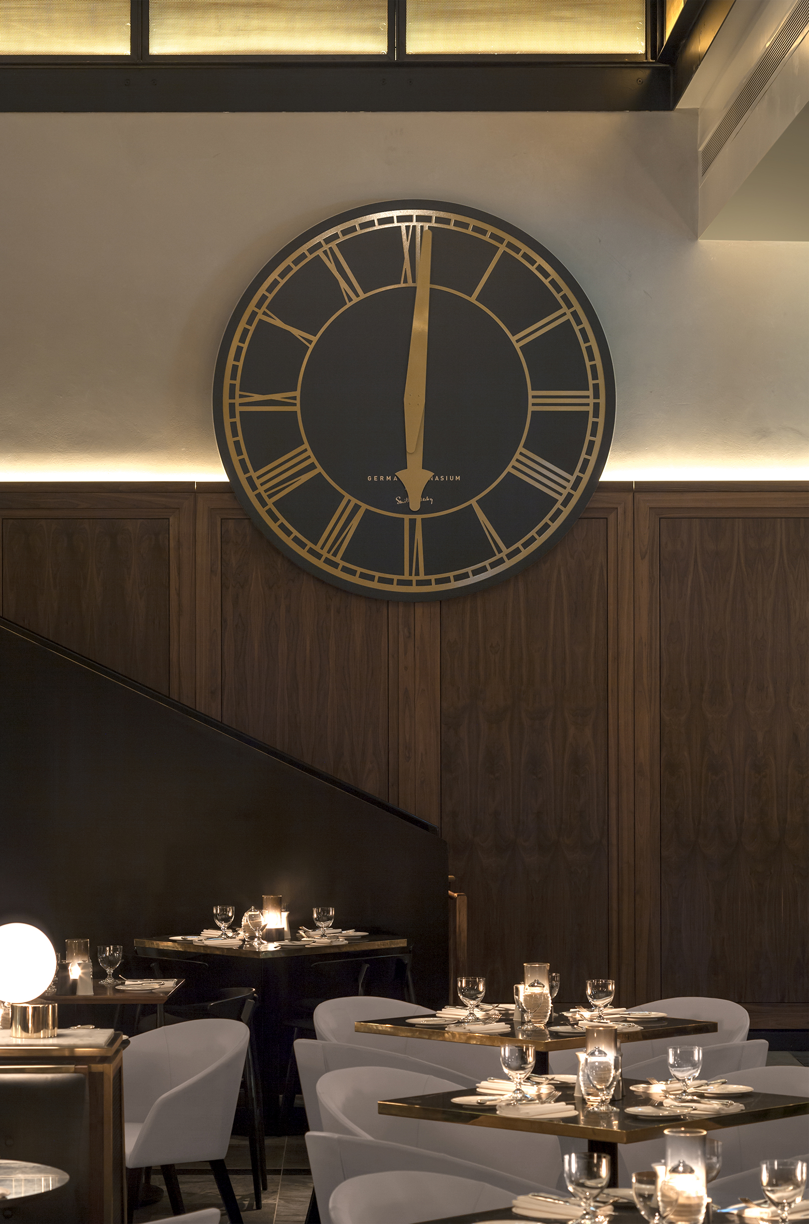 Designed by Conran and Partners, the restaurant is described as a modern interpretation of a classic brasserie with German overtones. Warm walnut timber paneling and black and gray distressed leather upholstery are set off against fresh, contemporary accents like an occasional pink and red tones. The space features two bars, a first-floor restaurant, Grand Cafe, and outdoor terrace.