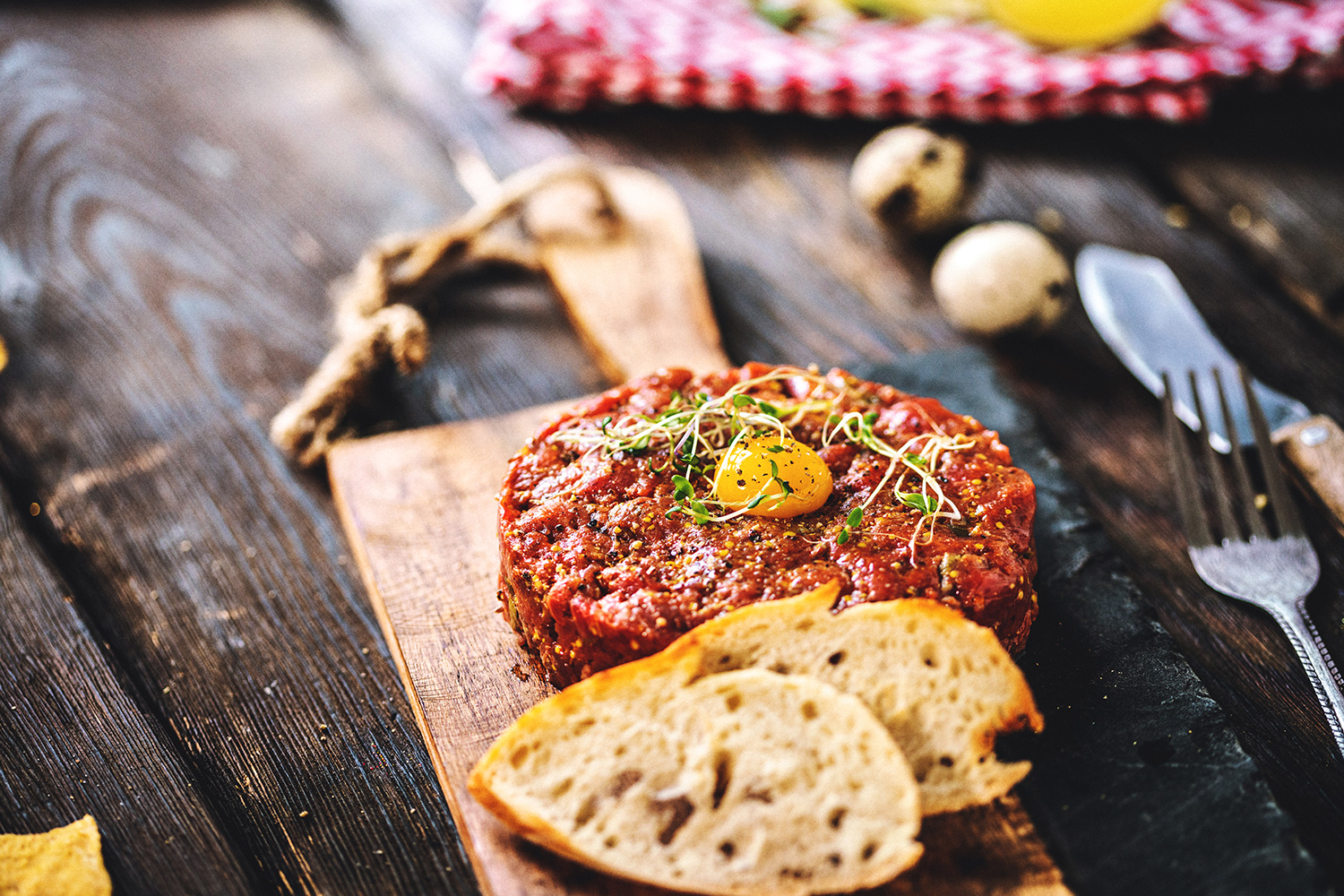 “Always use a prime cut of meat, such as tenderloin, sirloin strip or ribeye,” Smith says. “I find grass-fed tenderloin has the cleanest flavor and the best meat-to-fat ratio. When butchering, I like to remove all the sinewy fat from the external cut so you’re left with nothing but the lean meat.”