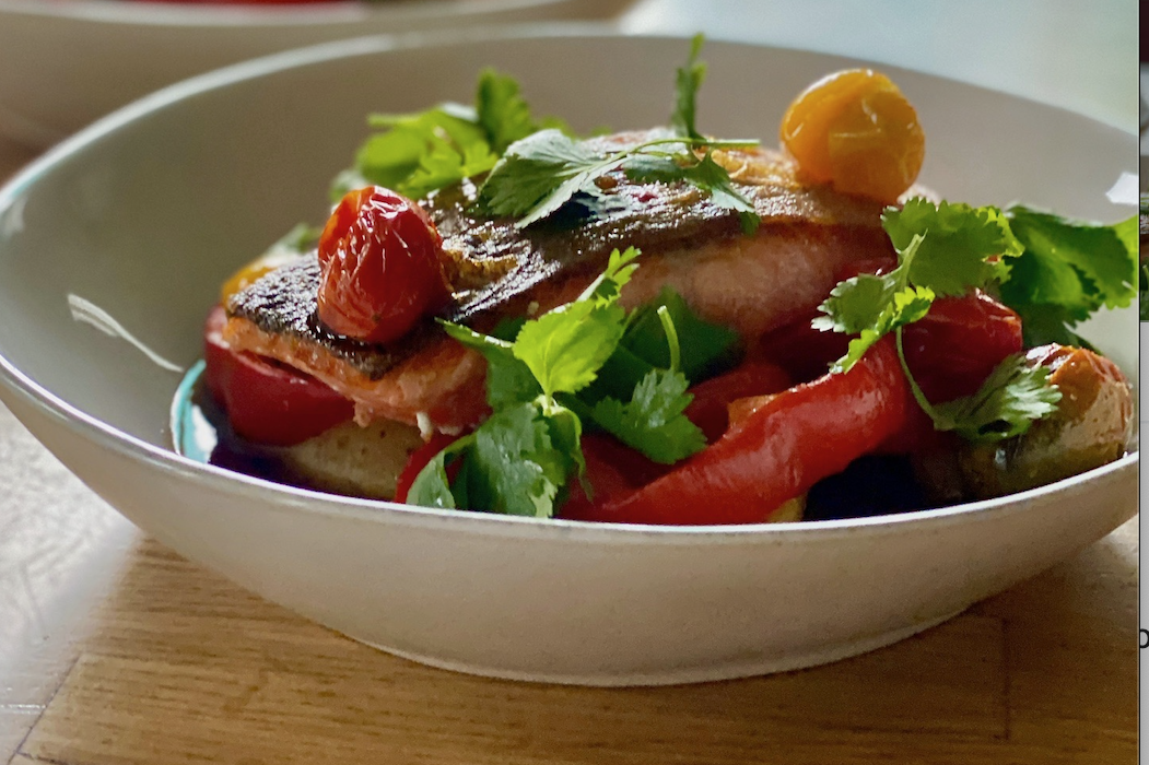 - Divide fingerlings and peppers evenly among your serving plates. Top each plate with a piece of salmon, roasted tomatoes and pickled onion and fresnos. Finish with a drizzle of buttery Peru sauce and torn leaves of fresh mint and cilantro. Serve any extra sauce on the side.