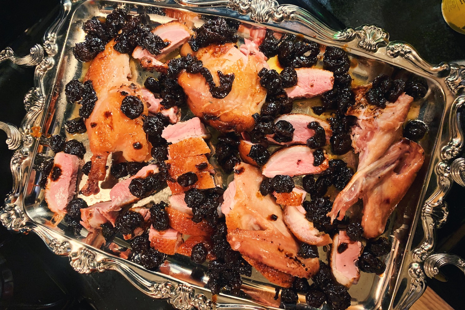 Transfer the flambéed duck to a cutting board and break it down: Slice off the legs and wings (they will be pink from the curing salt — don’t be alarmed), and then the breasts, which you can slice into individual pieces, about .5 inch thick. Stir any leftover juices from the flambé into the cherry jus. Arrange the sliced duck on a serving platter and spoon the sauce around it.