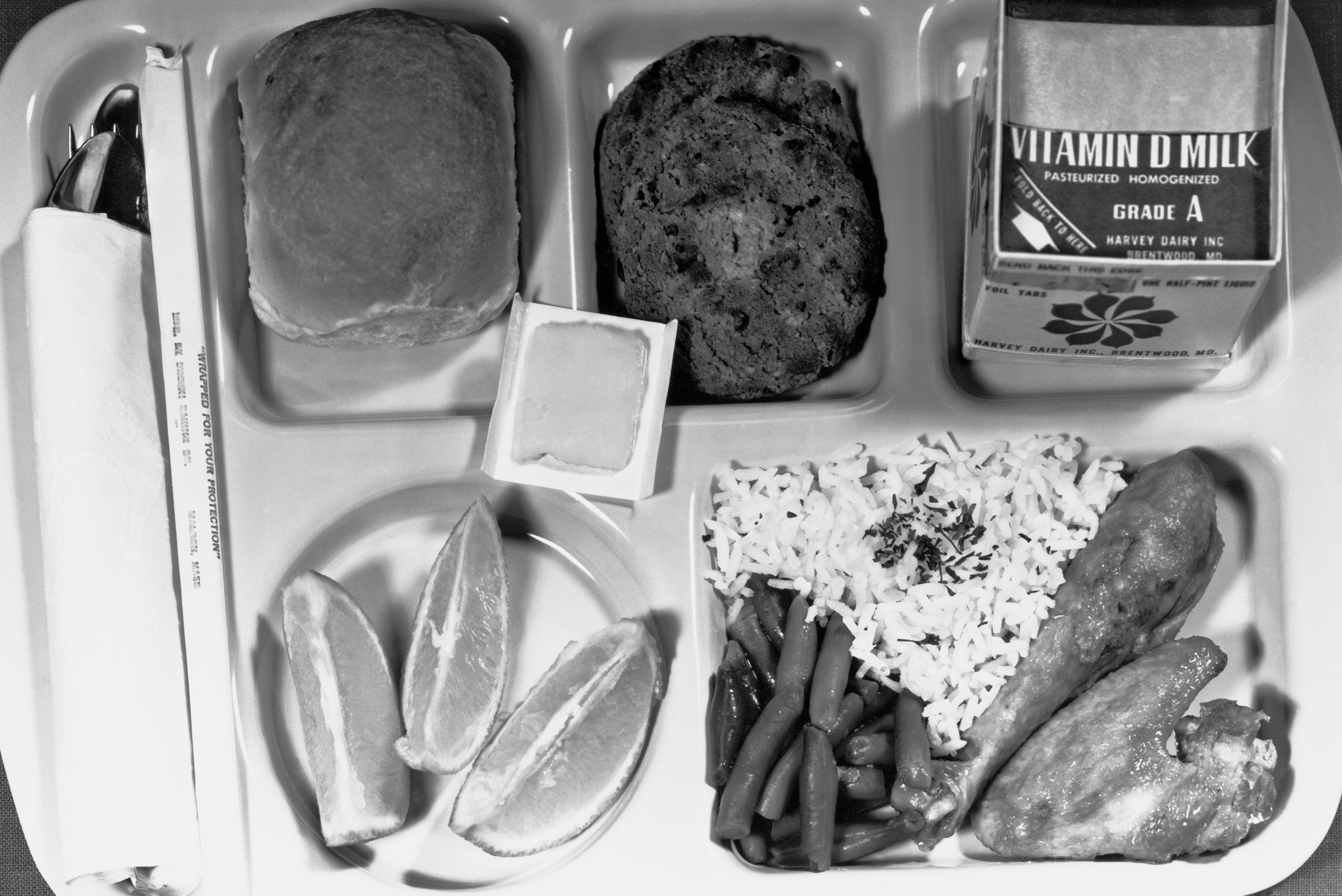 A Type A school lunch as specified by the Department of Agriculture, with a protein food, fruits, vegetables, bread and butter, and milk, Washington DC, June 1, 1966. ( Underwood Archives/Getty Images)