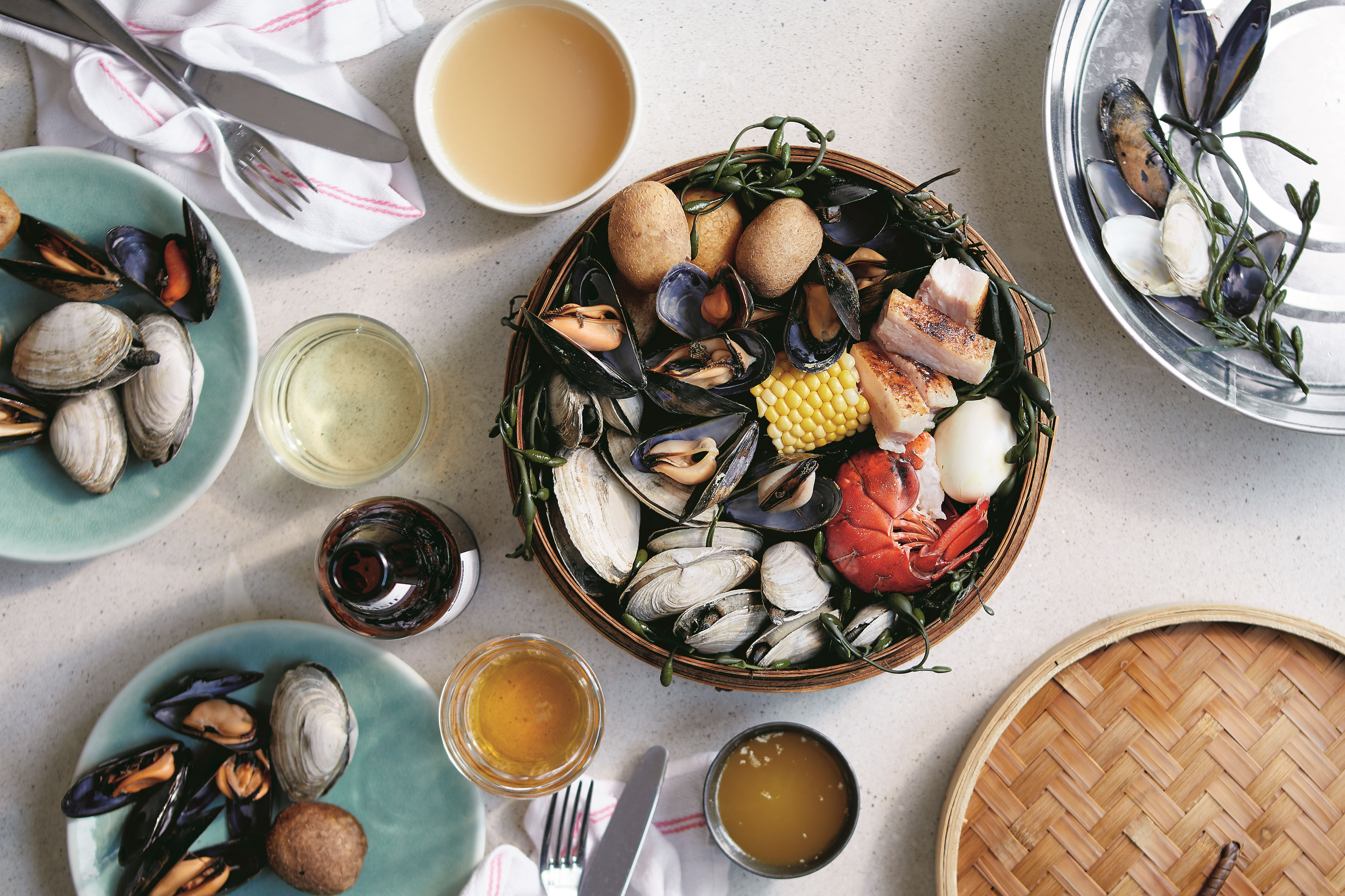 The clambake we serve in the restaurant includes potatoes, salt pork, steamers, mussels, lobster, smoked sausage, eggs, corn, butter and Nori Vinaigrette [that recipe is also in Eventide]. Feel free to add any type of hot sauce to dial up the flavors and textures and give people some room to explore different combinations. You don’t have to follow that approach exactly, but just look for ways to bring acidic, spicy, funky condiments and a carb wrapper of some kind to the table for that extra kick.
