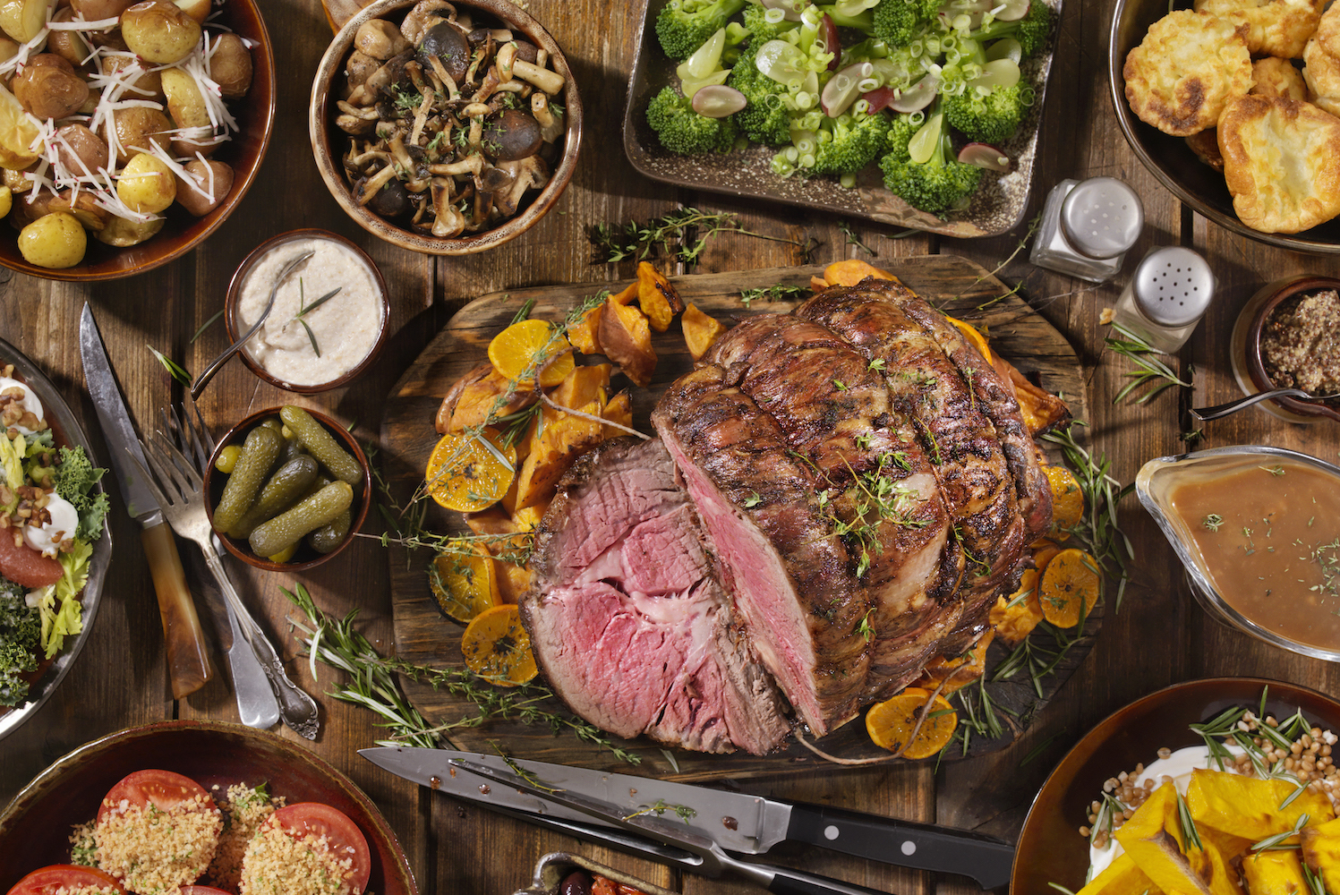 If you’re looking for “wow” factor at Thanksgiving, prime rib is the perfect choice. Not only is it visually impressive, but it is a much more forgiving main dish . Because of its high fat content, prime rib can hold at a temperature without drying out like turkey. Additionally, it doesn’t need any thawing or brining, making it an excellent “day of” choice. Plan for a half pound per person, as some of the weight is in the bones. Given how fantastic leftover prime rib is, don’t worry about going big here.