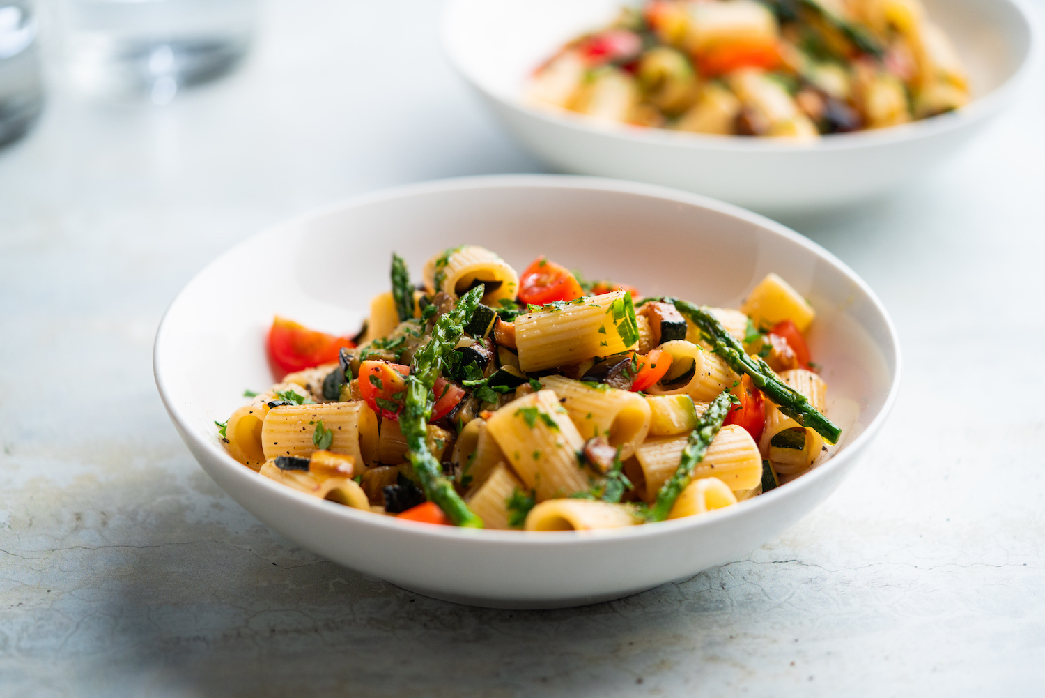 Pasta salad with grilled vegetables, zucchini, eggplant, asparagus and tomatoes