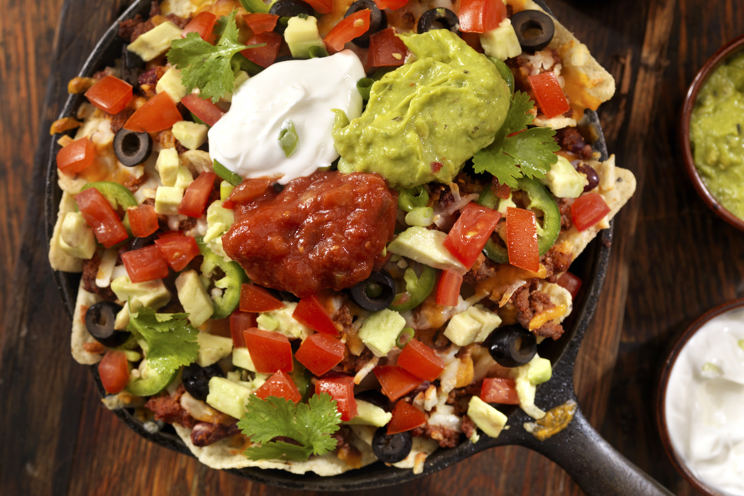 • 2 cups nacho toppings (onions, tomatoes, rice, beans, olives, avocado, guac etc.)