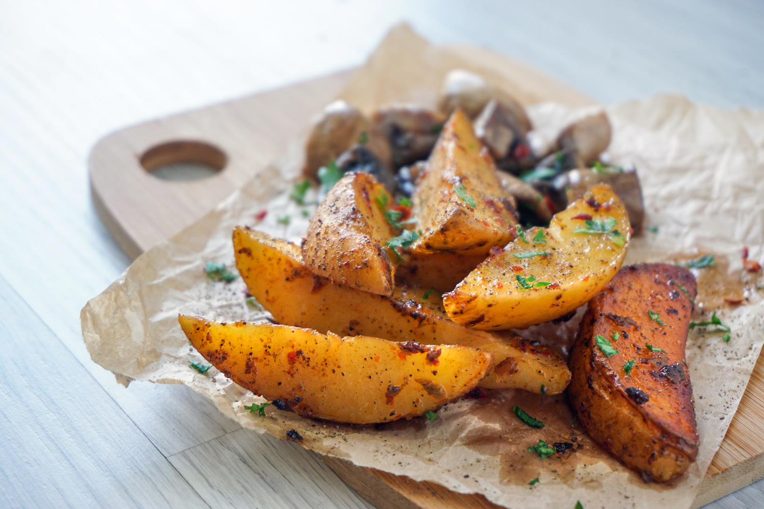 2. Slice the potatoes into 6 to 8 wedges each. Toss in the oil and ½ teaspoon of salt.
