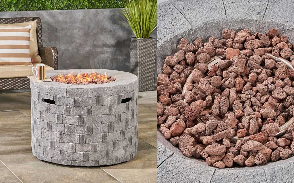 This sleek, gas-burning, rounded-fire pit is super lightweight and features a faux stone exterior designed to discreetly hide the propane tank, making it a real eye-catching piece for any outdoor setting.