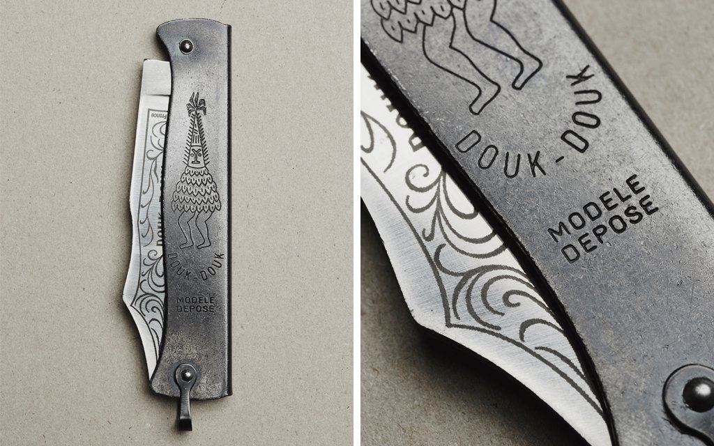 Story goes that Gaston originally intended to sell the knife to the Micronesian market, and so began flipping through an encyclopedia he had lying around his workshop. He stopped when he stumbled across an illustration of the Douk Douk (that is, the Melanesian spirit-god) that’s now engraved on the side of the helve. The knife got its name and one of its most distinguishing features in one fell swoop.