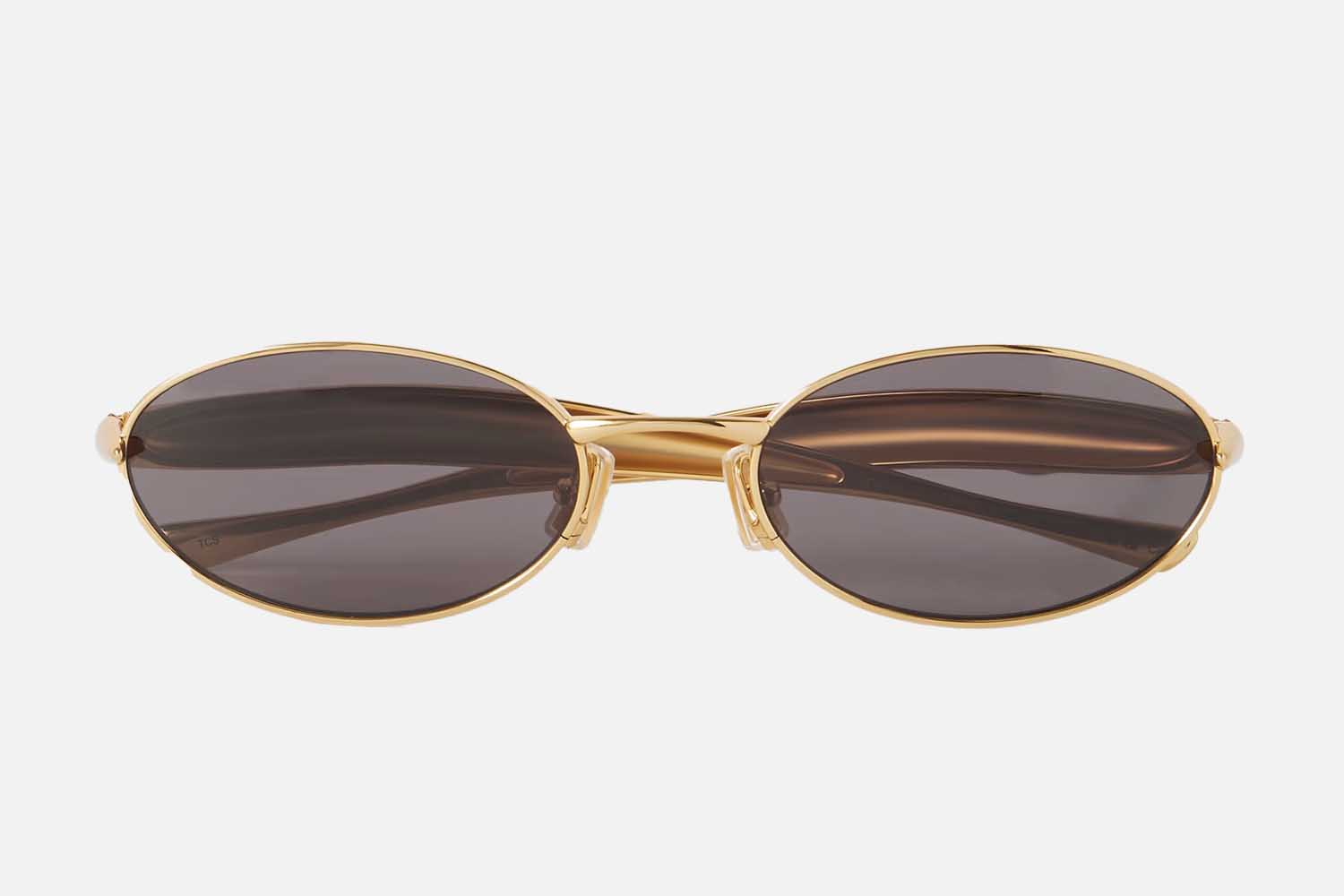 These designer shades are made in Japan with oval frames, sculptural gold-tone arms and gray-tinted glasses.