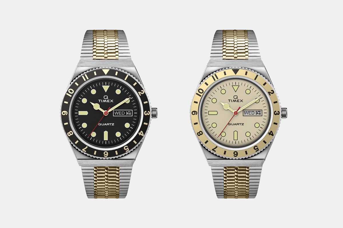 Calling all Timex enthusiasts: the brand has just released two new two-tone Q Timex watches as they continue to expand upon the Color Series. The watches are available in black or off-white, the dials and bezels completely filled out in solid color rather than the usual split-bezel look of the previous styles released. Yet the most noticeable change to the design is the two-tone bracelet, made entirely from stainless steel and featuring a gold band running down the center for a look that’s simultaneously unique and classic.