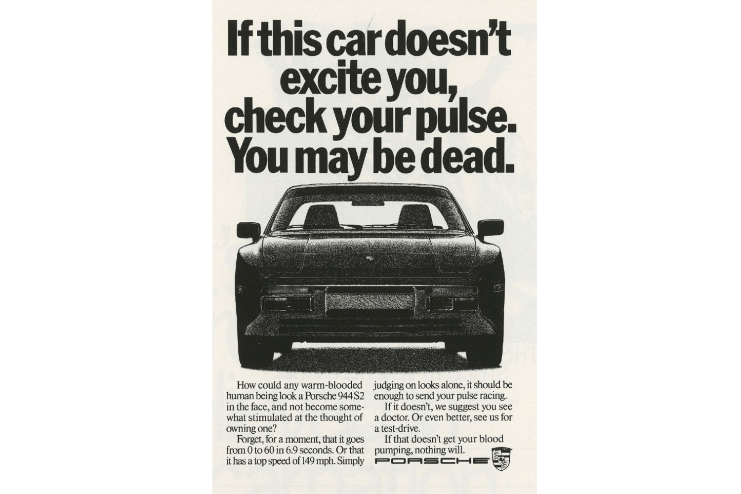 The Porsche 944 had a great run from the early 1980s to the early 1990s and was a fantastically popular car for the marque at the time. “Forget, for a moment, that it goes from 0 to 60 in 6.9 seconds. Or that it has a top speed of 149 mph,” the ad reads. “Simply judging on looks alone, it should be enough to send your pulse racing.” That sounds like a challenge, or at least a call to evaluate your priorities.