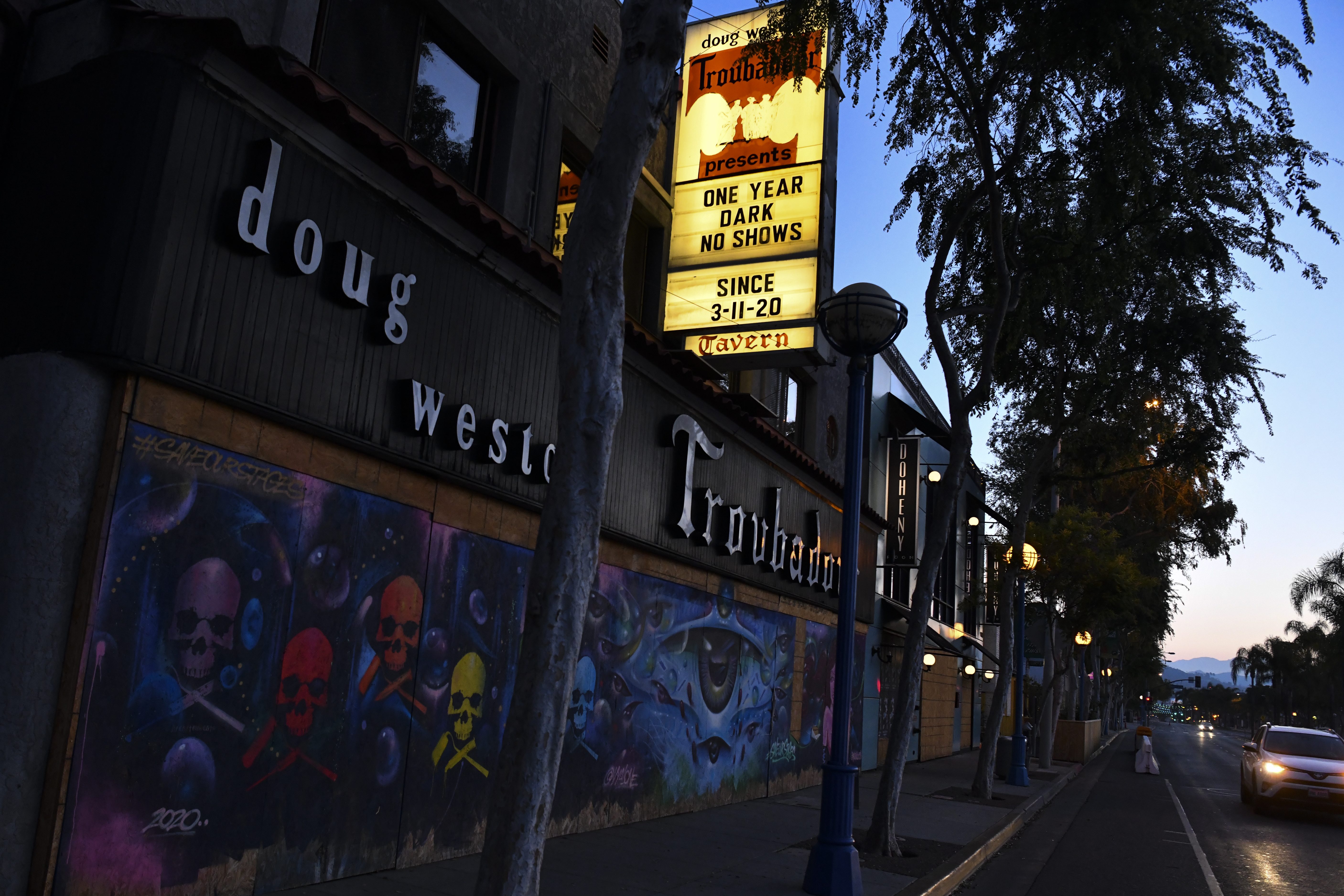 The Troubadour participates in Save Our Stages "One Year Dark" marquee campaign on March 13, 2021 in Los Angeles, California.