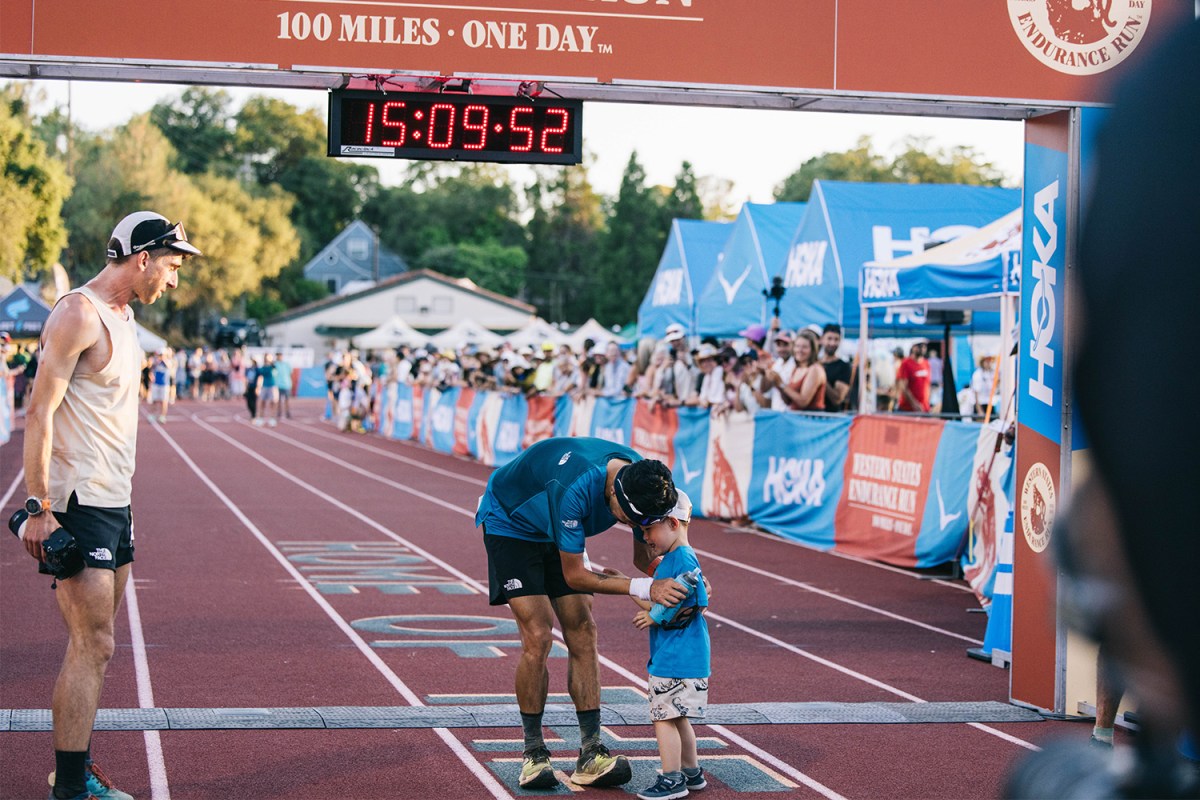 Jiasheng Shen finishes eighth overall, walking across the line with his son. Despite running faster than the previous year, he finished four places lower. The competition at Western States seems to intensify every year, with a deeper field and new strategies to push the sport forward.