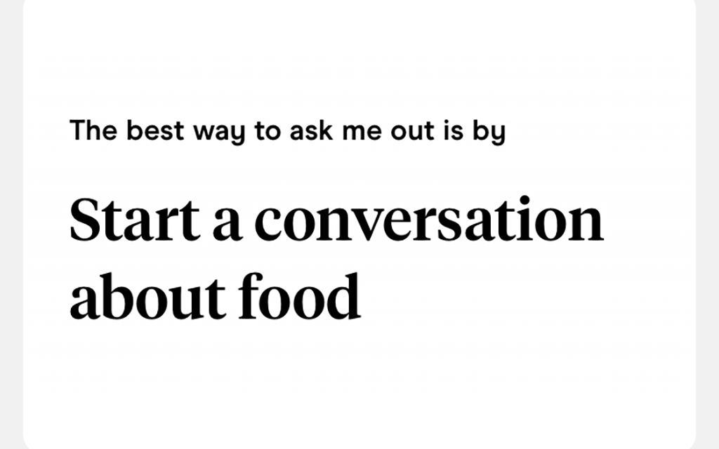 Essentially, we talk about food on dating apps because it’s easy. Along with air and water, it’s a fairly fundamental aspect of existence that we, theoretically, share with just about every other human we encounter, both on and off the apps.