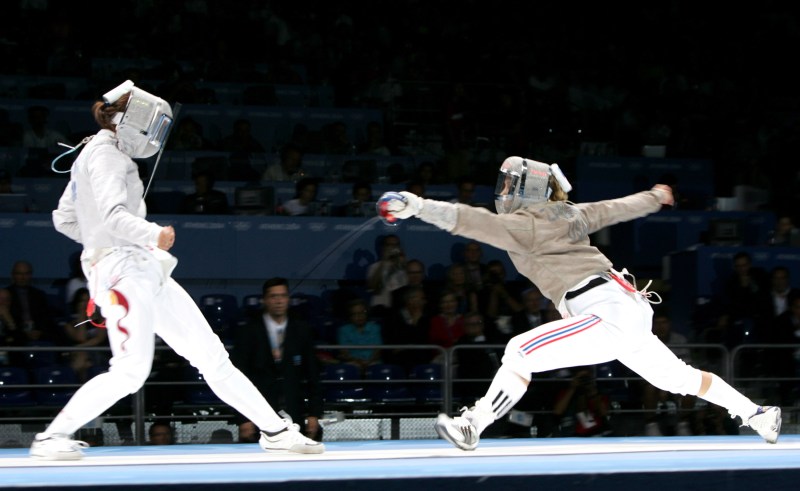Mariel Zagunis of the United States defeats Xue Tan of China for the gold medal in the Women’s Individual Sabre Finals Gold Medal Match during the Athens 2004 Olympic Games in Helliniko Fencing Hall in Athens, Greece, August 17, 2004. She wasn’t even supposed to be on the team, but was added when another fencer dropped out. She has since become the most decorated athlete in U.S. fencing history by defending her Olympic title in 2008 and winning five world championships. She won bronze medals in the 2008 and 2016 Olympics. (Allen Kee/Getty Images)