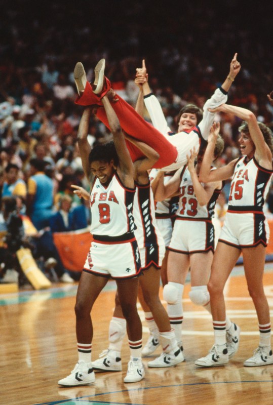 The US Olympic women’s basketball team celebrates their victory over Korea and their gold medal by carrying their coach. (Wally McNamee/CORBIS/Corbis via Getty Images)