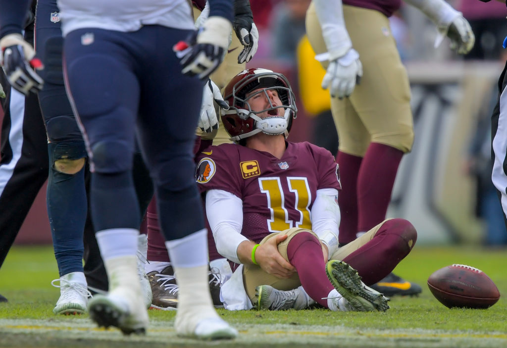 Washington Redskins quarterback Alex Smith (11) reacts to an injury in the third quarter during a game between the Washington Redskins and the Houston Texans at FedEX Field on November 18, 2018, in Landover, MD. (Photo by John McDonnell/The Washington Post via Getty Images)
