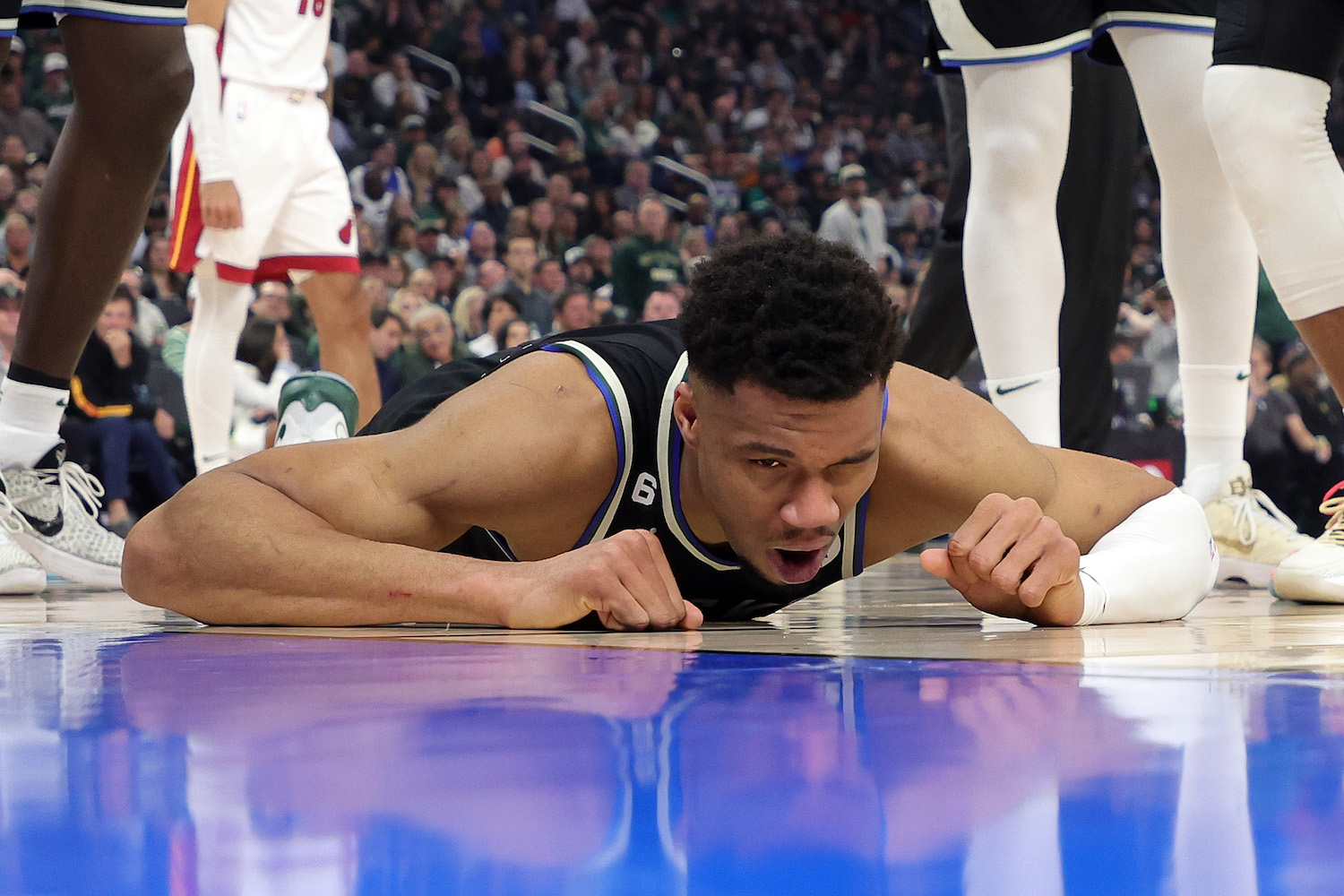 It was an ugly fall and, especially with players of his size, back injuries of any sort are a serious concern. Fortunately for the Bucks, the Heat have injury concerns of their own, albeit with a player of somewhat lesser significance — all due respect. Guard Tyler Herro broke his right hand while diving for a loose ball around mid-court during the second quarter. Grimacing in pain, he stayed on the floor and even attempted a three-point shot. But after missing it and getting examined, the Heat announced at halftime he would not return to the game. After the Heat win, Herro was seen with a cast on the hand.