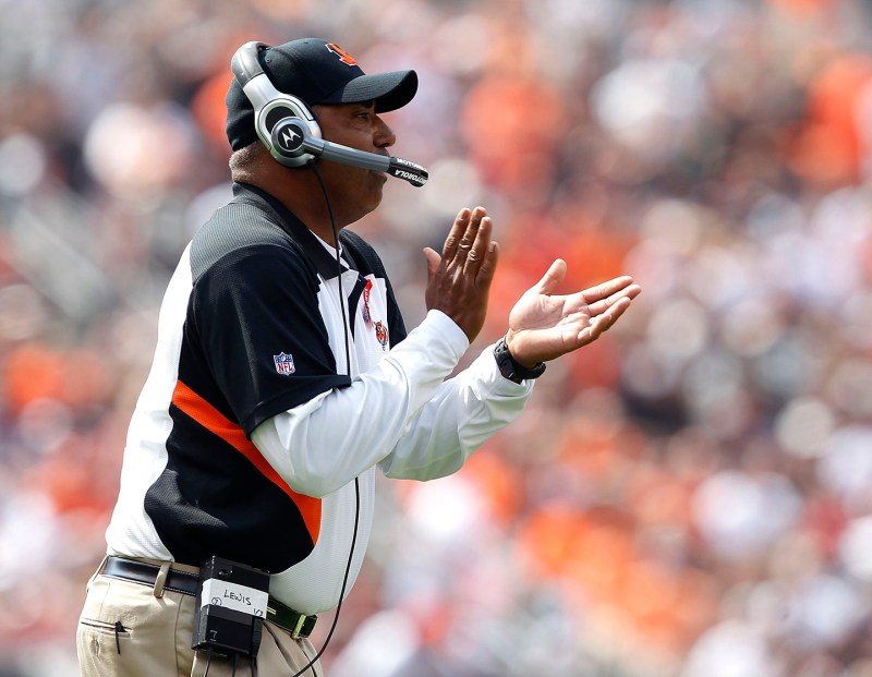 Will stay: Head coach Marvin Lewis of the Cincinnati Bengals. Here, he claps after a touchdown against the Cleveland Browns at Cleveland Browns Stadium on September 11, 2011, in Cleveland, Ohio. (Matt Sullivan/Getty Images)