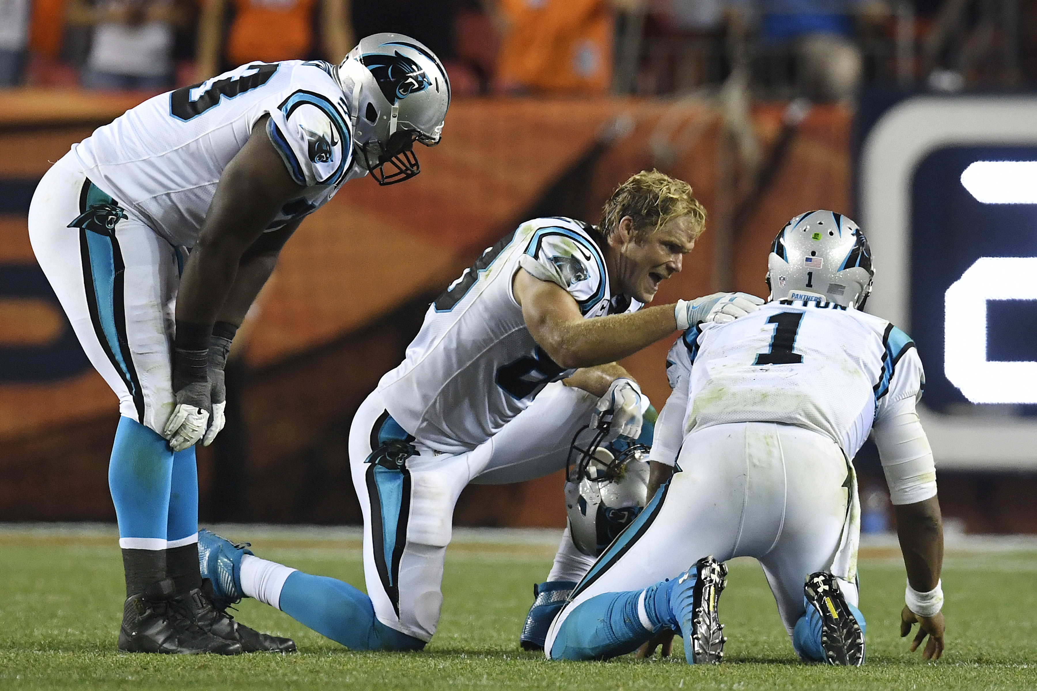 Greg Olsen (#88) of the Carolina Panthers and Donald Hawkins (#78) check the health of Cam Newton (#1) after he was pummeled by Shaquil Barrett of the Denver Broncos and Darian Stewart during the fourth quarter of the Broncos’ 21-20 win. The Broncos hosted the Carolina Panthers on Thursday, September 8, 2016. (Helen H. Richardson/The Denver Post via Getty Images)