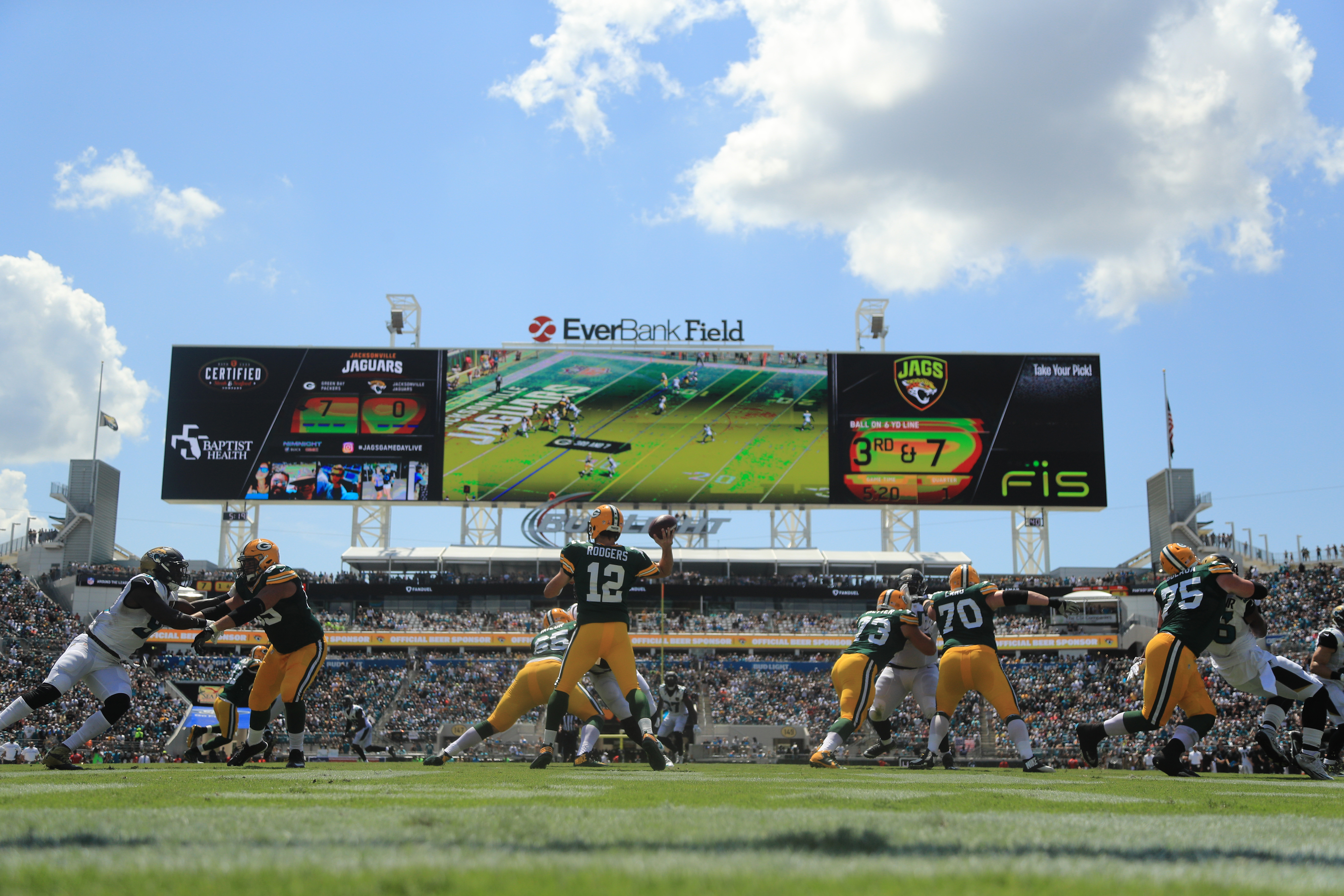 Aaron Rodgers #12 of the Green Bay Packers attempts to pass during the game against the Jacksonville Jaguars at EverBank Field on September 11, 2016 in Jacksonville, Florida. (Mike Ehrmann/Getty Images)