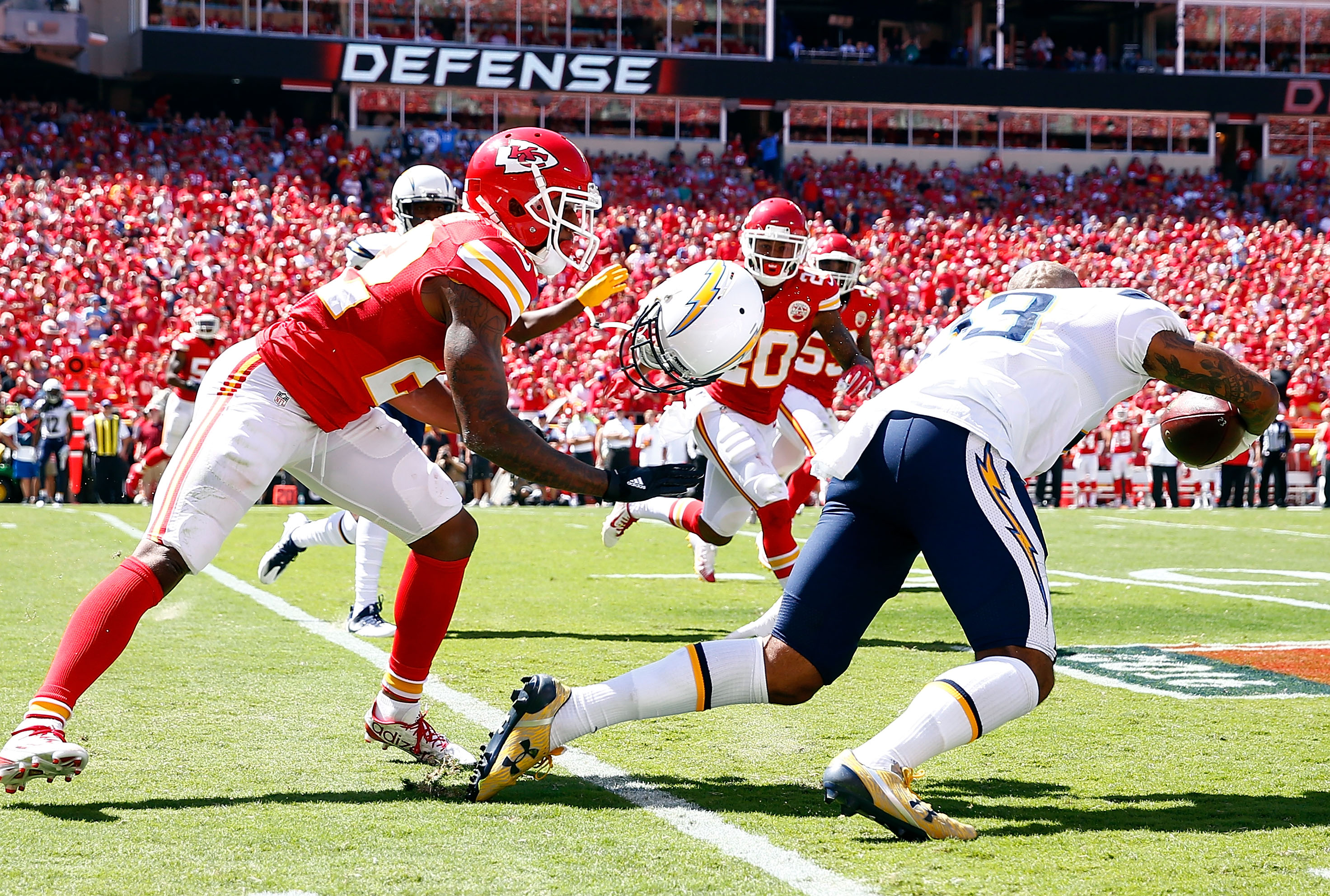 Defensive back Marcus Peters #22 of the Kansas City Chiefs rips the helmet off of wide receiver Keenan Allen #13 of the San Diego Chargers during the game at Arrowhead Stadium on September 11, 2016 in Kansas City, Missouri. (Jamie Squire/Getty Images)