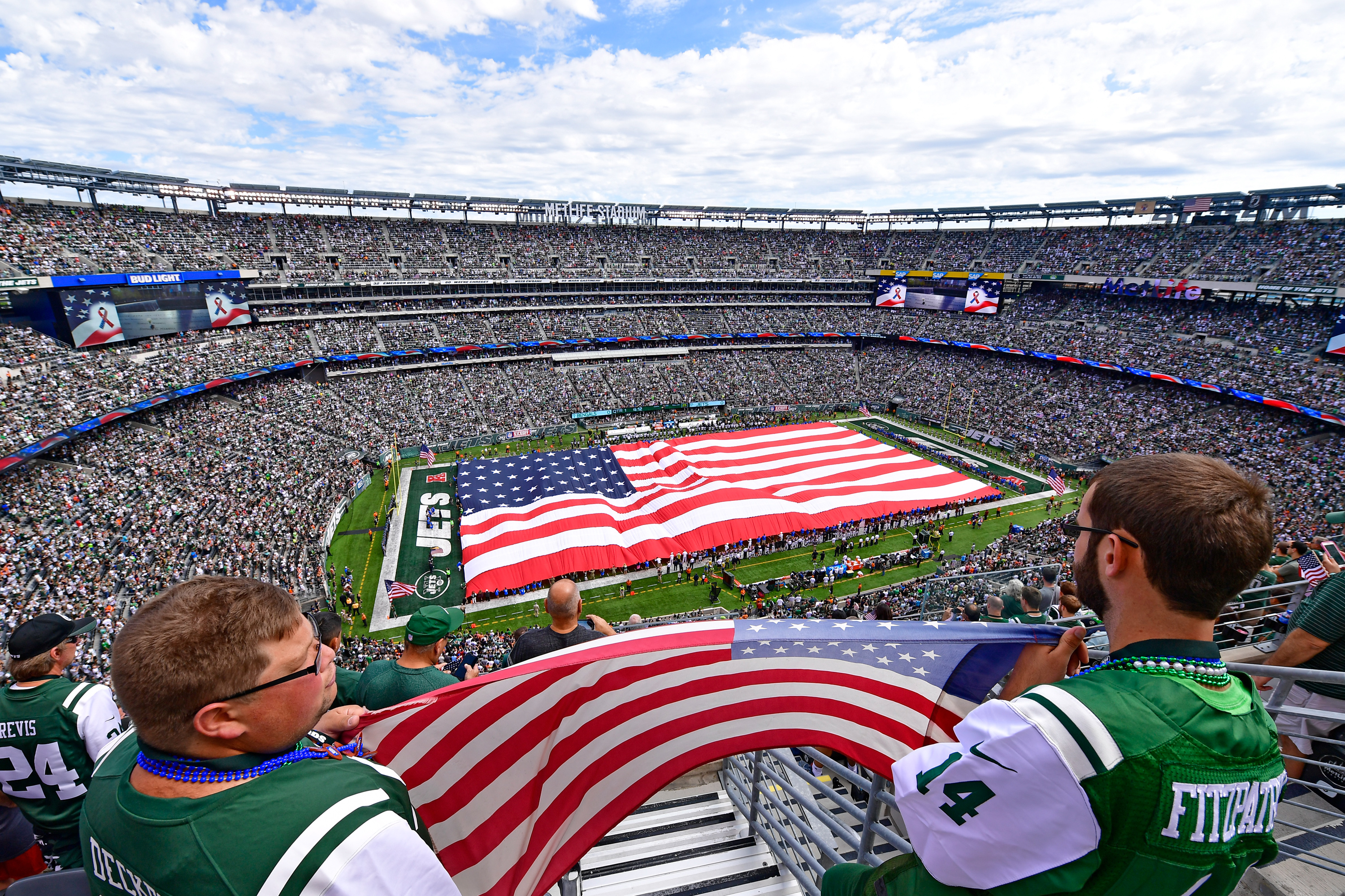 Fans hold an American flag during the National Anthem prior to the game between the New York Jets and the Cincinnati Bengals at MetLife Stadium on September 11, 2016 in East Rutherford, New Jersey. (Steven Ryan/Getty Images)