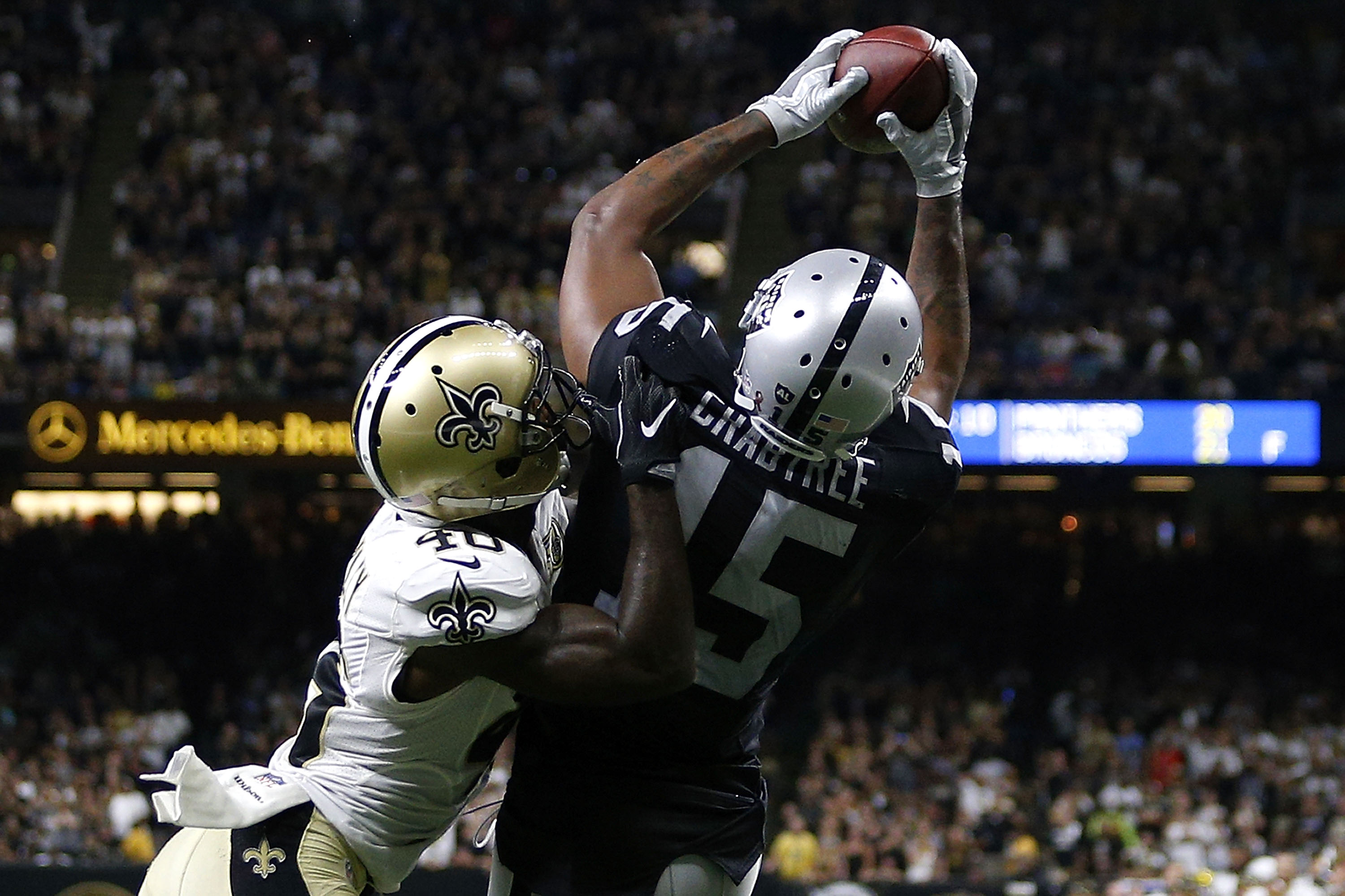 Michael Crabtree #15 of the Oakland Raiders catches a pass over Delvin Breaux #40 of the New Orleans Saints completing a two-point conversion to take the lead late in the second half of a game at Mercedes-Benz Superdome on September 11, 2016 in New Orleans, Louisiana. (Jonathan Bachman/Getty Images)