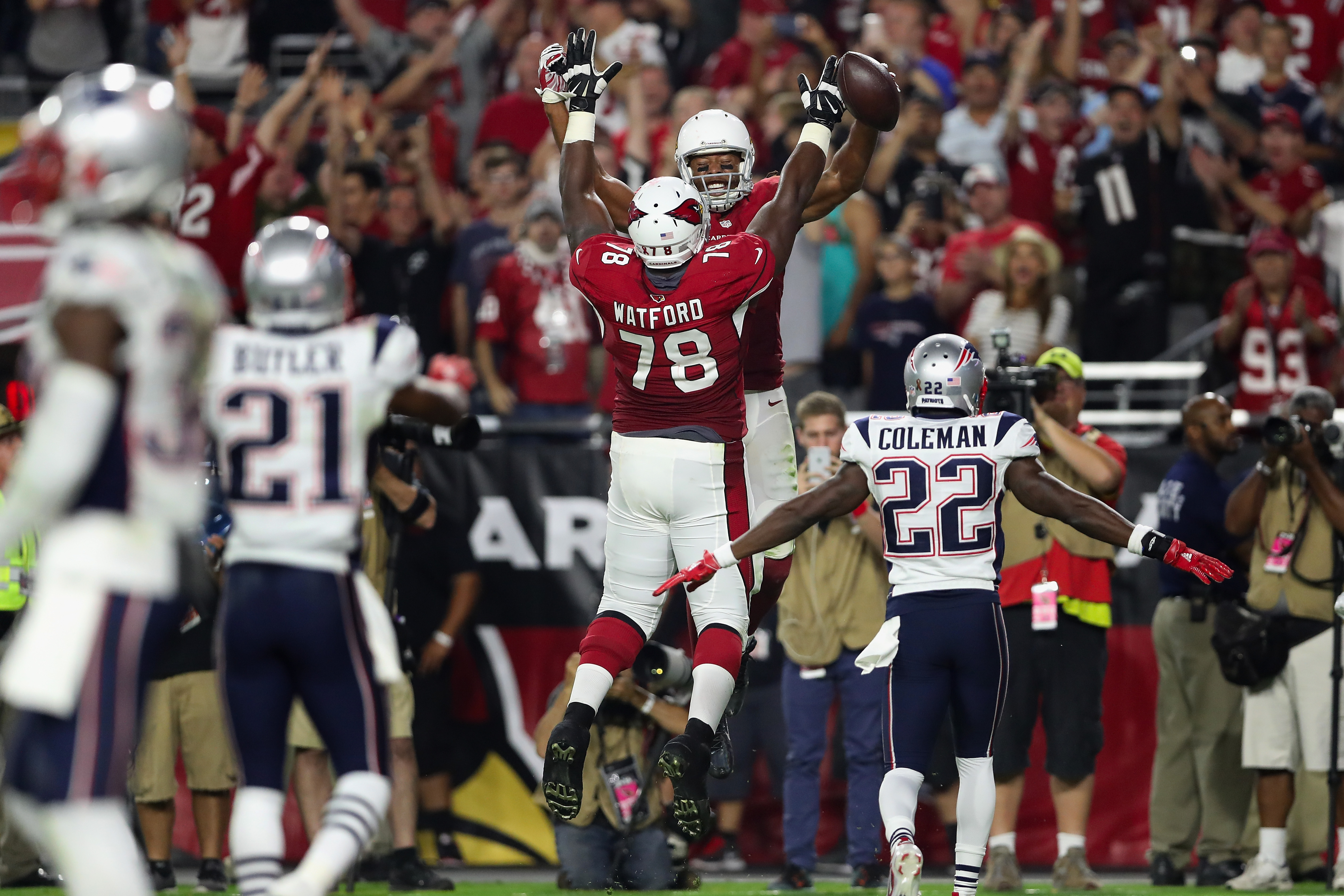 Wide receiver Larry Fitzgerald #11 of the Arizona Cardinals celebrates his 100th career touchdown with offensive tackle Earl Watford #78 during the fourth quarter of the NFL game against the New England Patriots at the University of Phoenix Stadium on September 11, 2016, in Glendale, Arizona. (Christian Petersen/Getty Images)