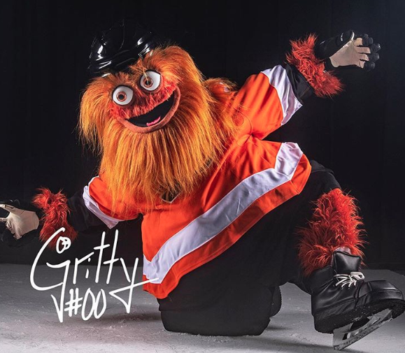 Lacking a nose, Gritty is “the ultimate Flyers fan who loves the orange and black, but is unwelcoming to anyone who opposes his team.”