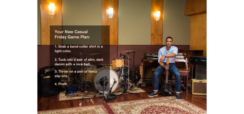 Think of his band collar like a churched-up henley: same collarbone-bearing machismo up top, just with a little dress shirt swagger down low that allows for a slightly more refined kit. So tuck it, untuck it … live your life. Just know this: looks good slightly rumpled, looks even better with the sleeves rolled up, and should never, ever be worn with a suit.