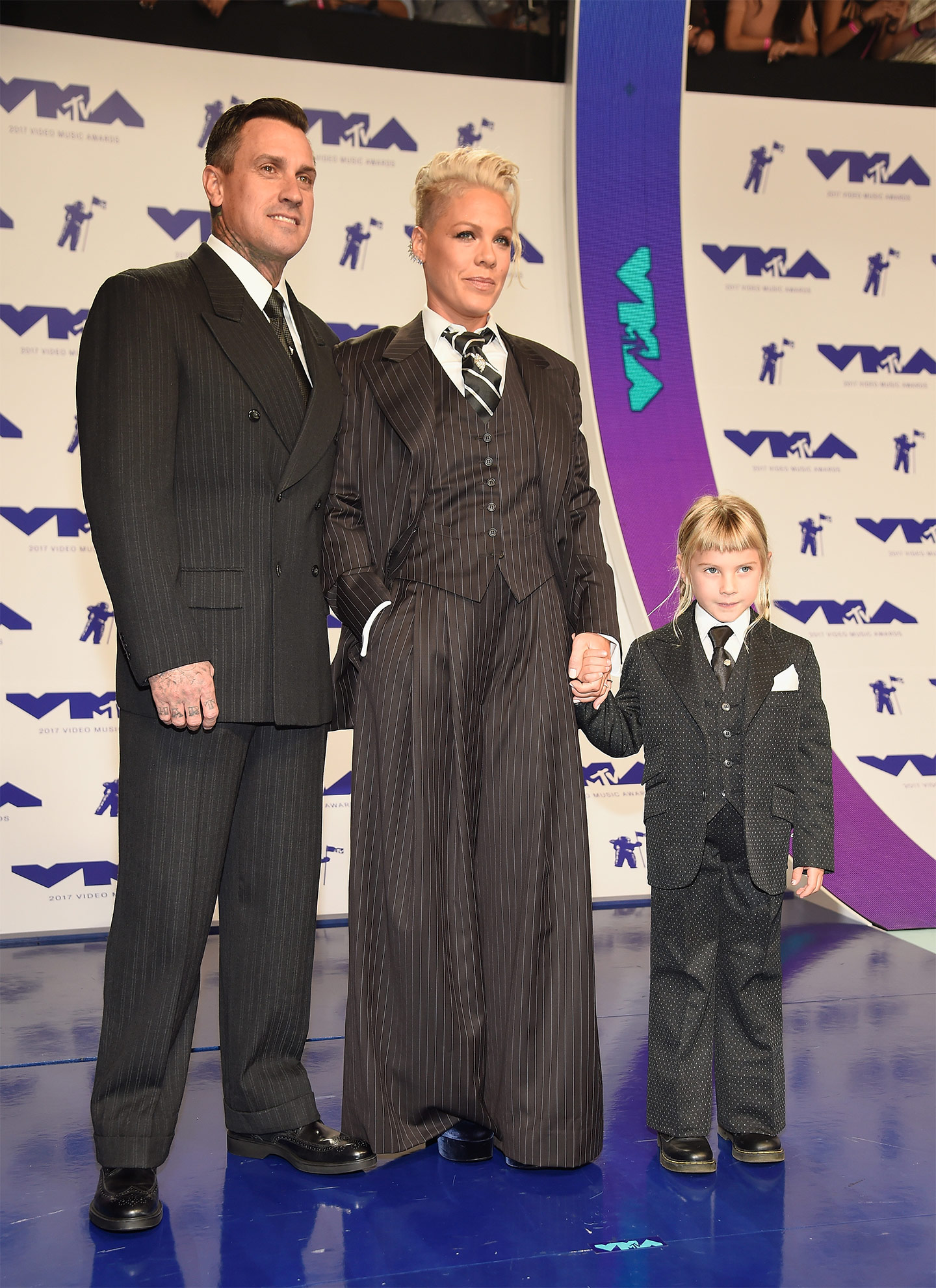 Carey Hart, Willow Sage Hart and Pink attend the 2017 MTV Video Music Awards at The Forum on August 27, 2017 in Inglewood, California. (Kevin Mazur/WireImage)
