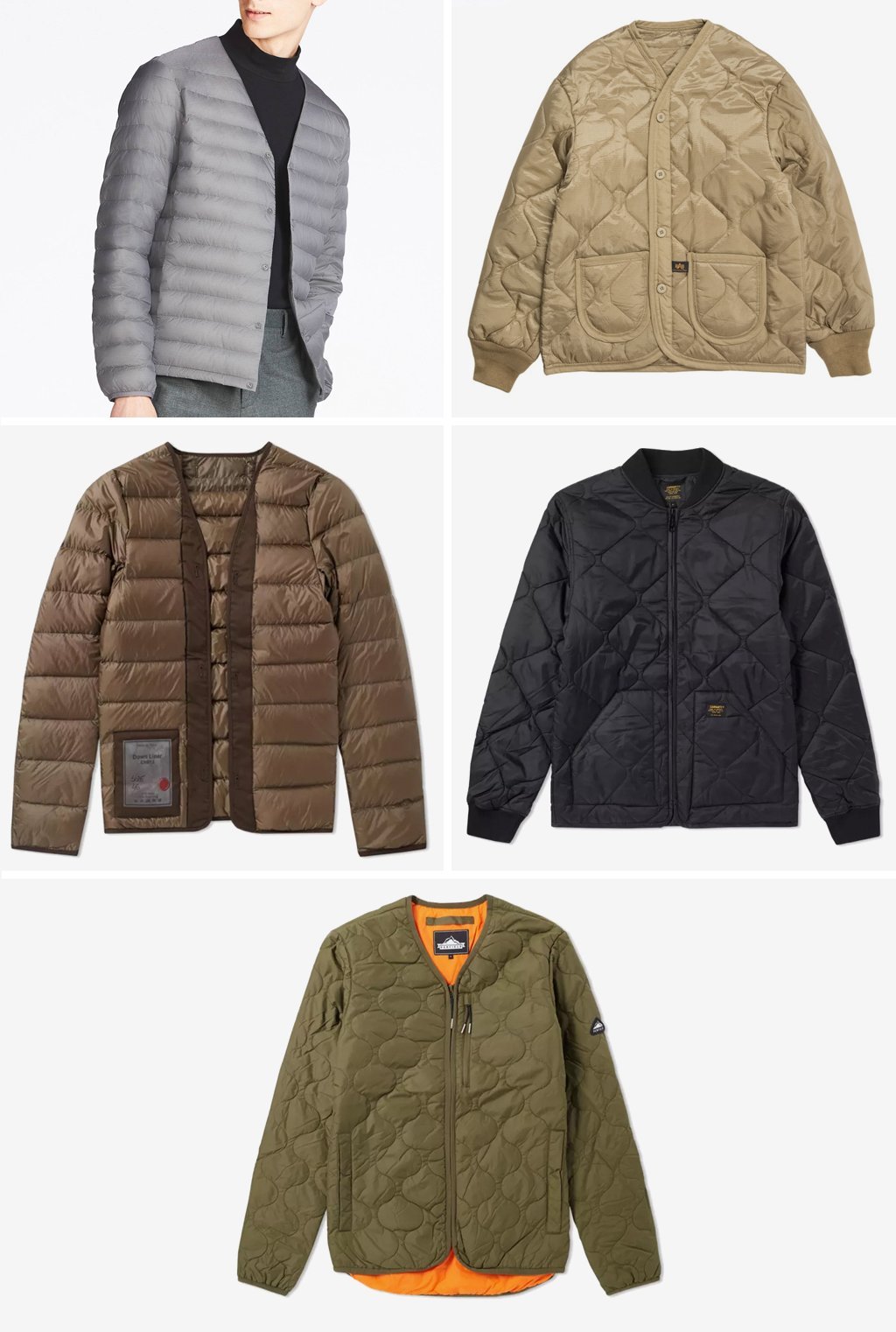 Clockwise, from left: Uniqlo Ultra Light Down Compact Jacket $60 $40; Alpha M-65 Liner $65; Carhartt Newton Bomber Liner $155; Penfield Oakham Jacket $169; Ten C Nylon Down Liner $279