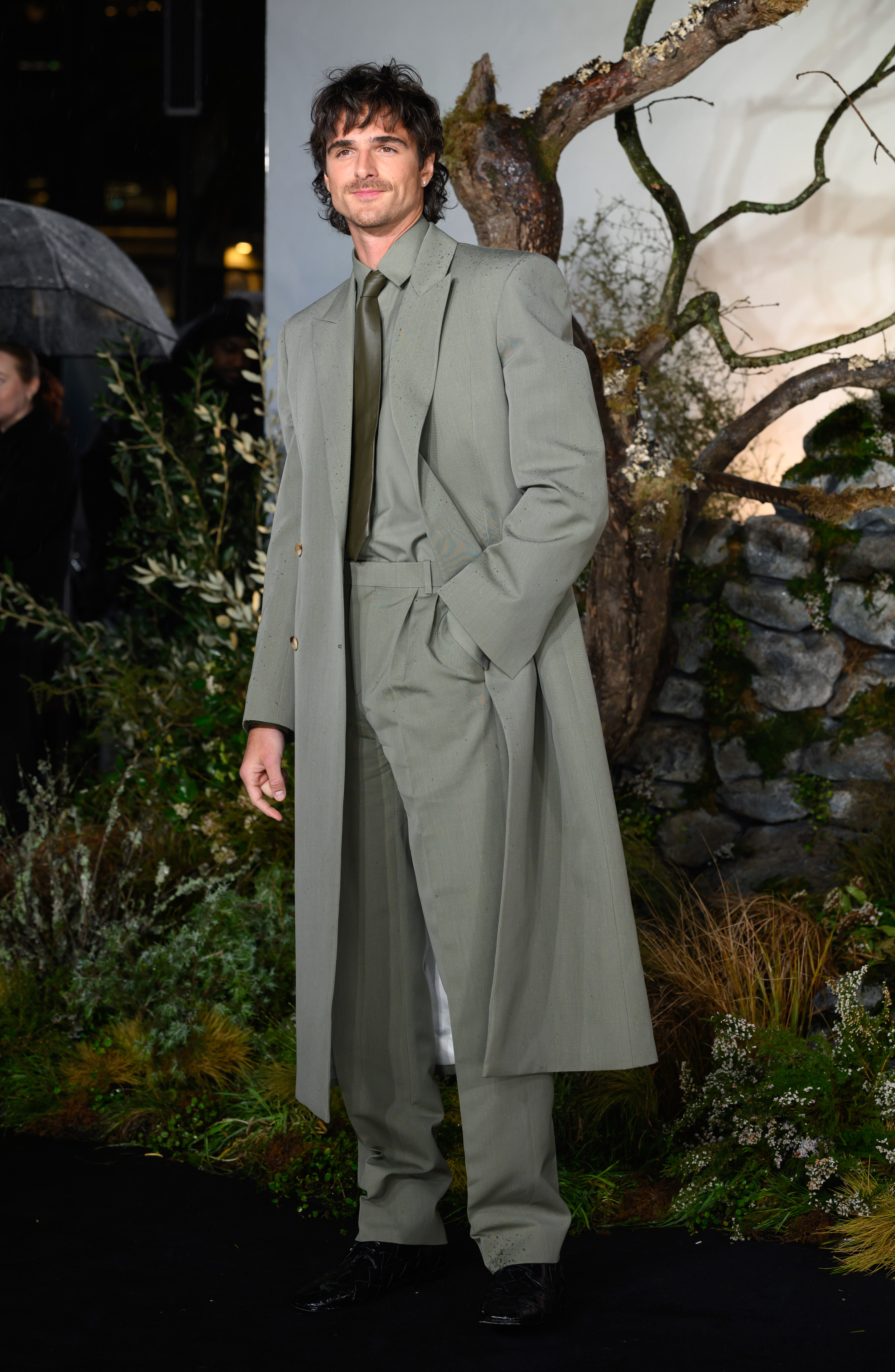 Take, for instance, the film’s recent U.K. premiere in dreary London. As you might expect, Elordi looked incredibly dapper in a long, grey-green Bottega Veneta two-piece, with trench-inspired tailoring — the look included a floor-length coat, generously pleated trousers and a tonal leather tie — a welcome addition to the actor’s sartorial canon of custom Bottega, for which he has been a brand ambassador for years. (It was made all the more romantic-lead-coded when classic English weather left the actor’s perfect micro-mullet and oversized frame more drenched than Mr. Darcy in Pride and Prejudice.)