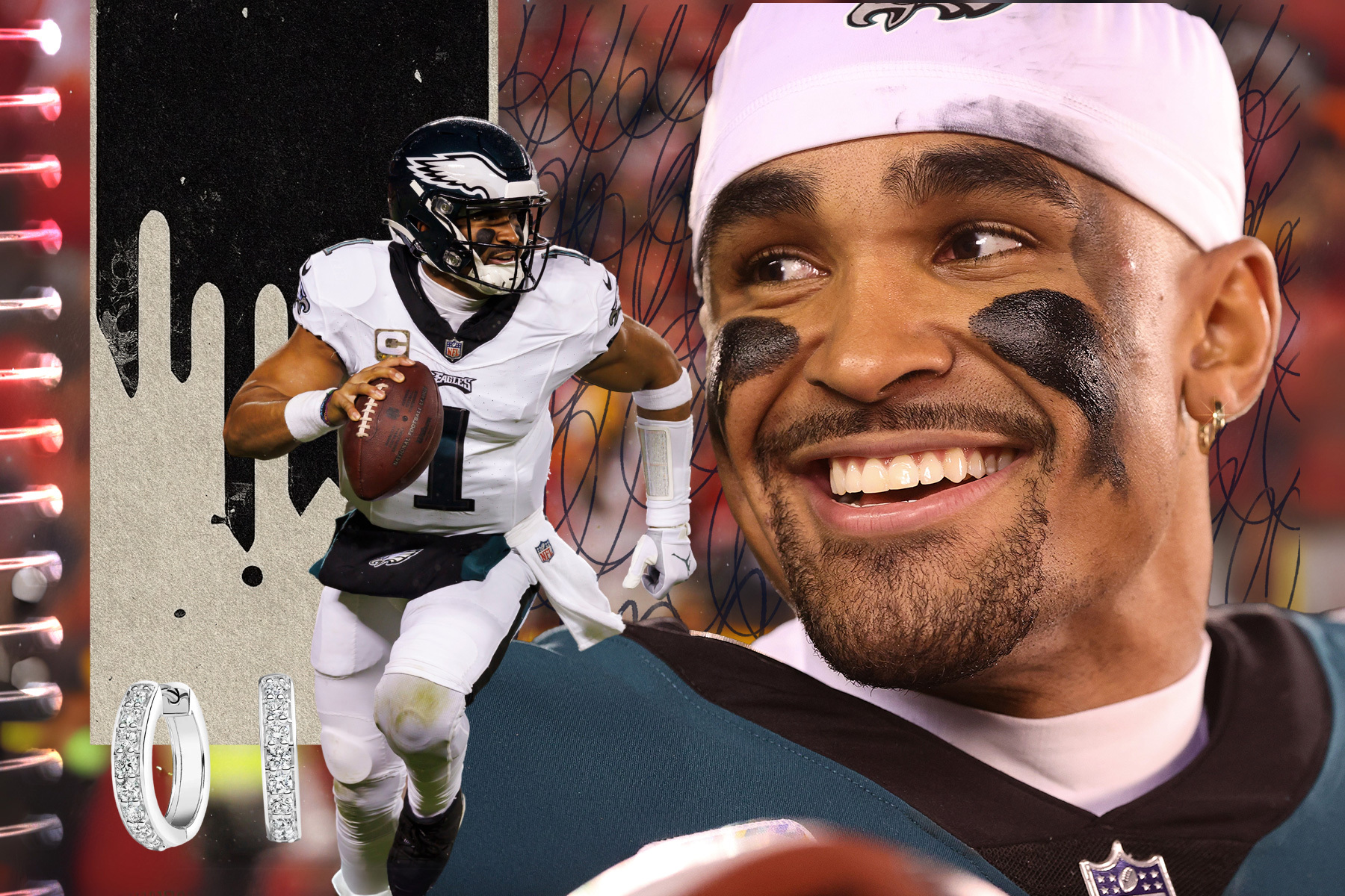 This isn’t the first time I’ve written about the stylings of Philadelphia athletes. Back in 2020, former 76ers star Jimmy Butler bared midriff at a Sixers practice and inspired me to publish a piece on the male crop top. (What can I say? My hometown city’s athletes have swag!) Though, honestly, I hadn’t noticed Hurts’s ear accessory until last week’s Super Bowl media day, when he wore a hoop earring to every interview. I then began doing research (typing “jalen hurts earring” into Google search), and discovered that he’s been wearing a single hoop earring for years now. Sometimes it’s a slim, simple gold hoop like the one he wore for Super Bowl LIX and sometimes it’s a bolder, diamond-encrusted variation.