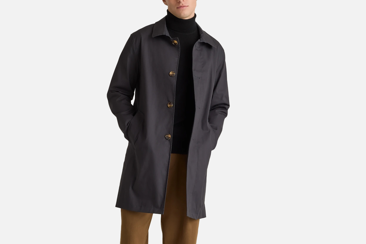 Uniqlo’s very modern take on the trench coat is another affordable option. It features a relaxed silhouette and a clean-looking front flap design with a waterproof fastener to keep rain out.