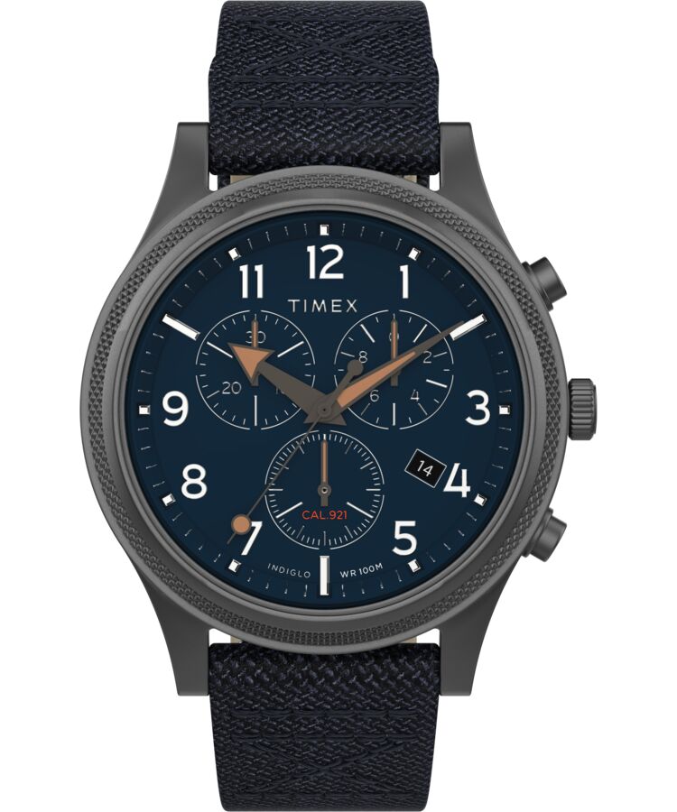In addition to a 100-meter water-resistant gunmetal case protecting its movement from anything you can throw at it, the Timex Allied® LT Chronograph is a masterclass in sartorial coordination. The navy dial and fabric strap? Keeping things sporty and playing off your tie and shoes. The tan accents across all six hands? A nice nod to the brown of your suit. The classic white of the markers? Back to your shirt and shoes. It’s subtle details like this that really make an ensemble sing and set you apart from the pack.